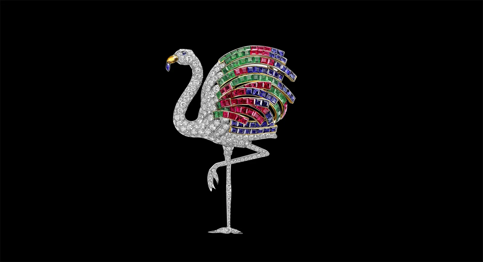 Since the 1940s Cartier has populated its sparkling universe with animal figures and plumed creations of fireflies, butterflies, birds of paradise and kingfishers. Cartier’s famous Flamingo Brooch, commissioned by the Duke of Windsor in 1940, soon landed in the jewellery box of Wallis Simpson, the Duchess of Windsor. Striking a pose, the elegant platinum and yellow gold flamingo is embellished with brilliant-cut diamonds, calibré-cut emeralds, sapphires and rubies: the stones were reused from other pieces owned by the Duchess. The beak of the bird is set with a cabochon citrine and sapphire, while its eyes feature a similarly cut sapphire, and the head, neck, body and hinged legs of the bird are accented with paved circular, brilliant and single-cut diamonds. The Flamingo Brooch was eventually sold at a Sotheby’s auction in 2010 for £1,721,250 against an estimate of £1.5m.