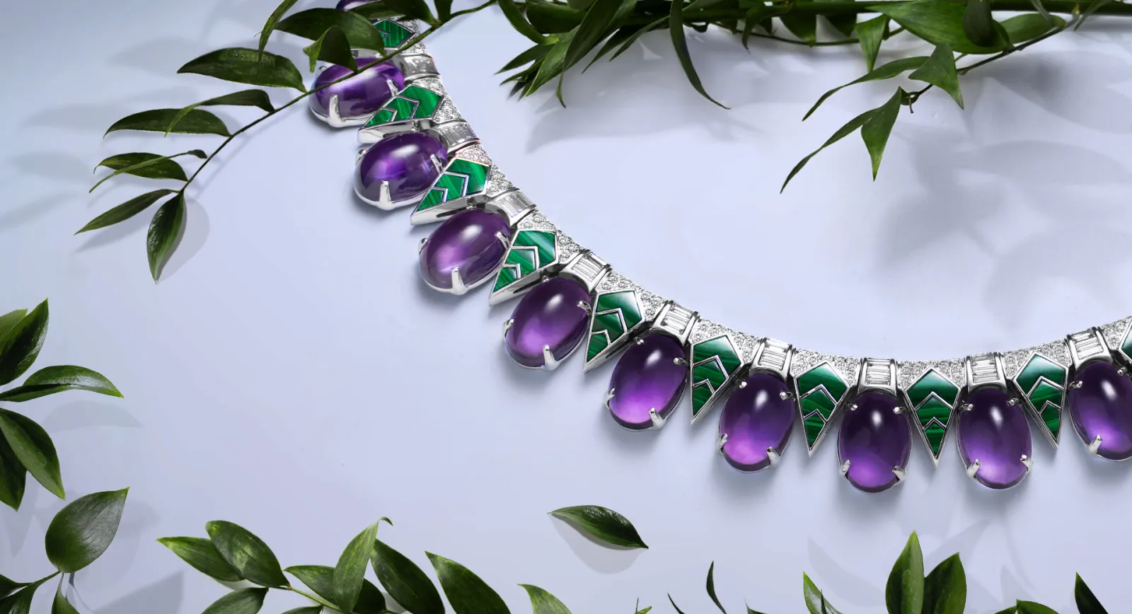 The second positive result of the earth’s abundance of amethysts is that designers have a much larger source of important carat-weight gems to play with. Because their growth conditions are less harsh than those of a diamond or emerald, jewellery designers can choose large-sized amethysts to feature in their jewellery pieces. Luxury jewellery brands such as Boodles and Chaumet create attention-grabbing cocktail rings with this stone, whilst the House of Taffin has created a choker featuring a single 143.22-carat amethyst. In recent years, the famous American brand Tiffany & Co. revived its iconic Bird on a Rock motif through a series of one-of-a-kind necklaces, one of which features a 15.95-carat cushion-cut amethyst.