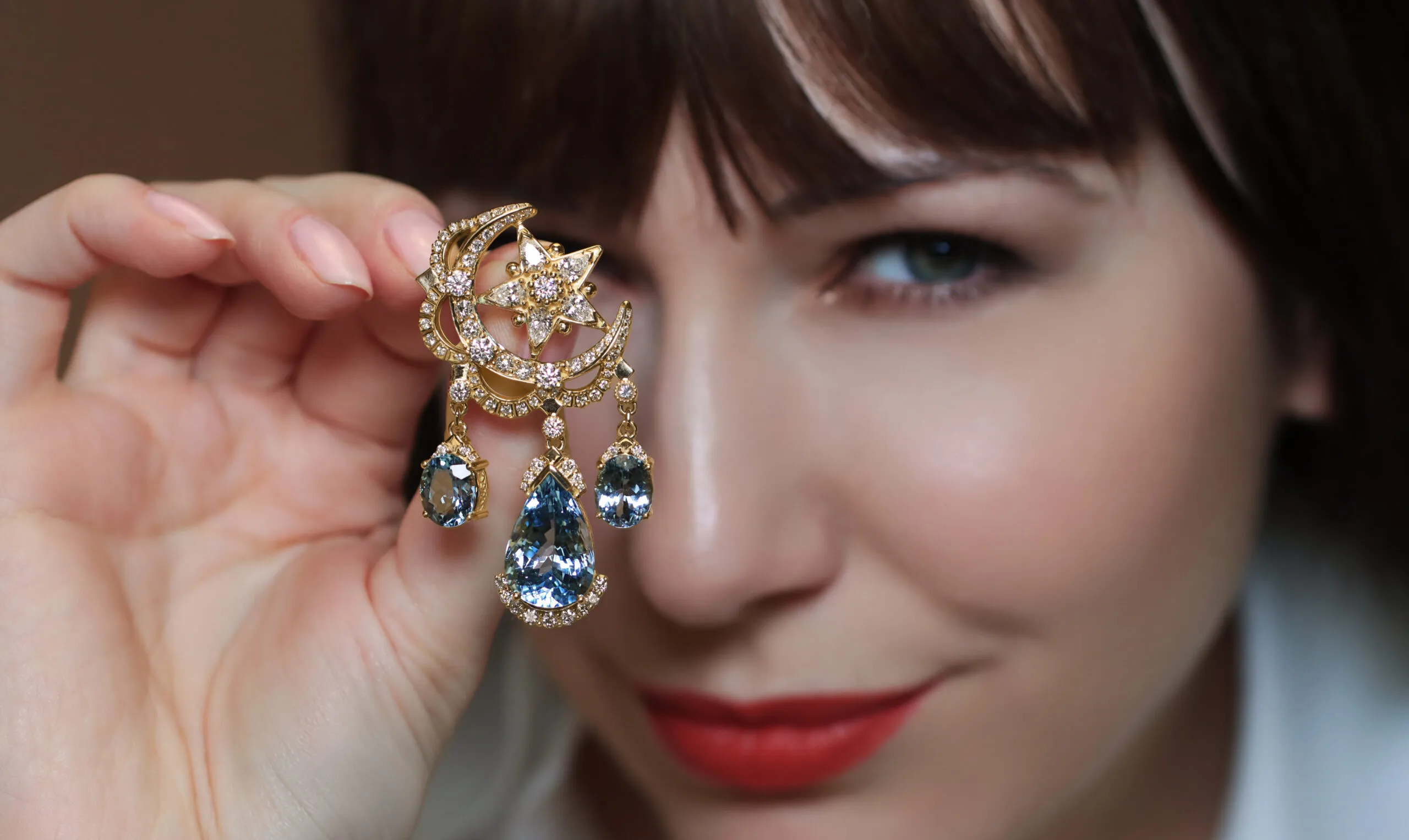 Another seamless new addition to Tales of the Nile is the Garden of Light choker that combines a 17.9-carat pear-cut aquamarine with swags of Japanese Akoya pearls. Amina says that from the moment she saw this elongated sky-blue gem, she imagined a Victorian-style choker with the era’s gothic twist softened by a V-shaped diamond-set motif and filigree work (inscribed with the Arabic script for ‘blessings’). The Garden of Light earrings with pear-shaped aquamarines are the perfect accompaniment, as is the Garden of Light ring with a very subtly pear-shaped aquamarine surrounded by golden flowers and round brilliant-cut diamonds. To dig deeper into the Victorian style of the Garden of Light choker, you may be tempted by the Ottoman Star & Crescent brooch, also with pear-shaped aquamarines. From the 1860s onwards, stars and crescent moons were hugely popular motifs in jewellery, brooches and hair ornaments in Victorian society. This also coincides with the Ottoman period in Egypt (which ended in 1914) and its traditional celestial iconography.