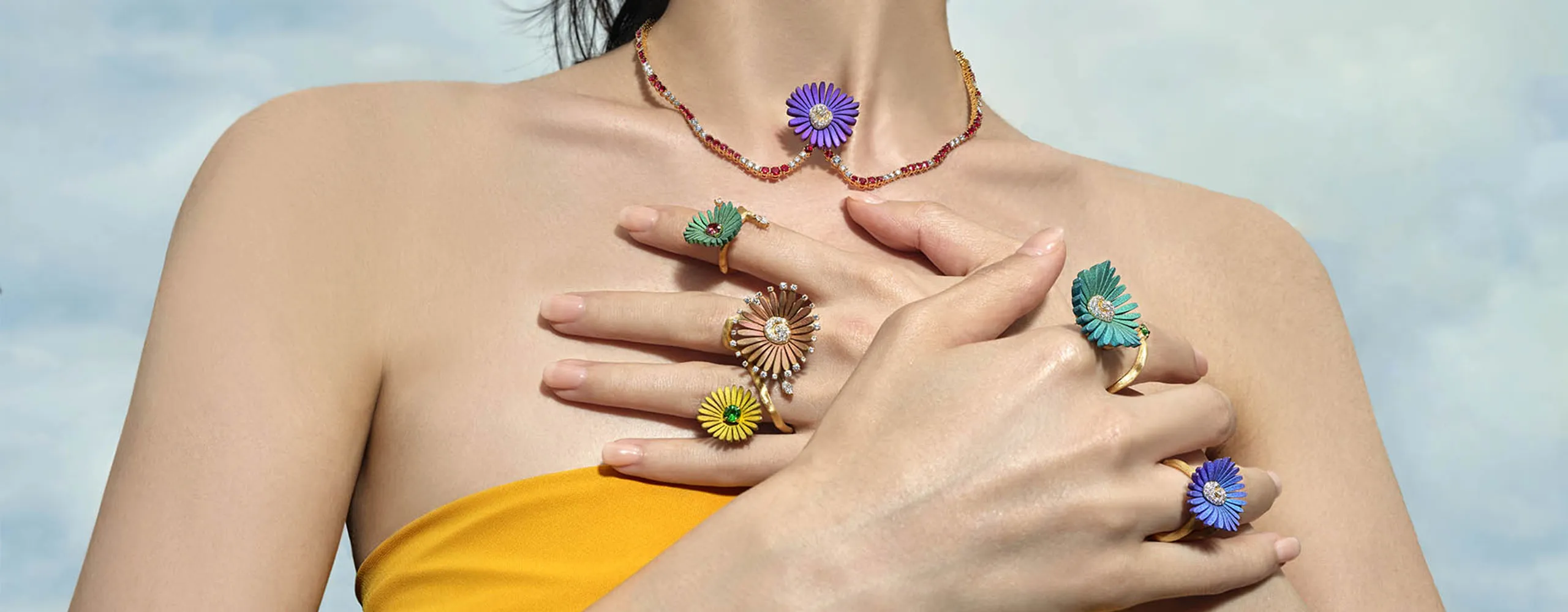 - Explore floral jewels that sparkle with pavé diamonds and colourful gemstones.