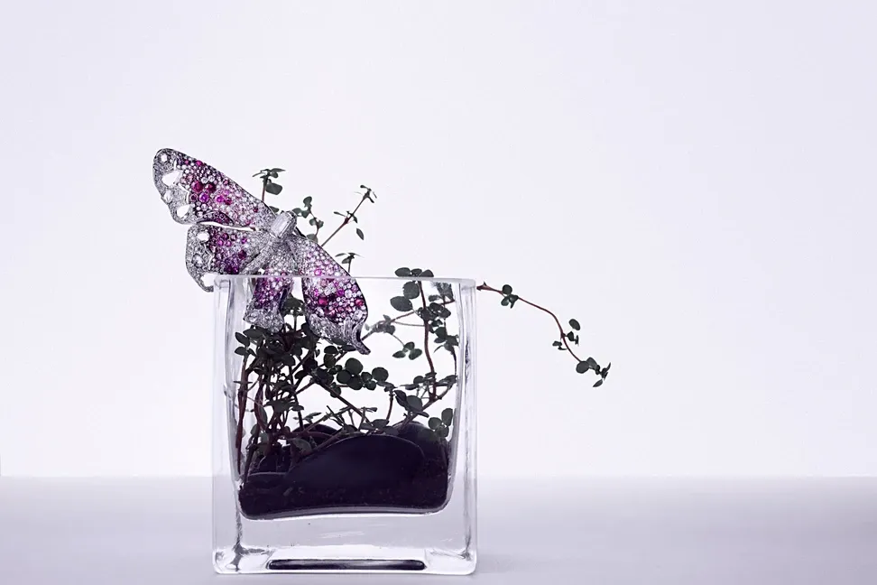 Cindy Chao summer butterfly ring with diamonds, rubies and rhodolites from the 10th Anniversary Butterfly collection