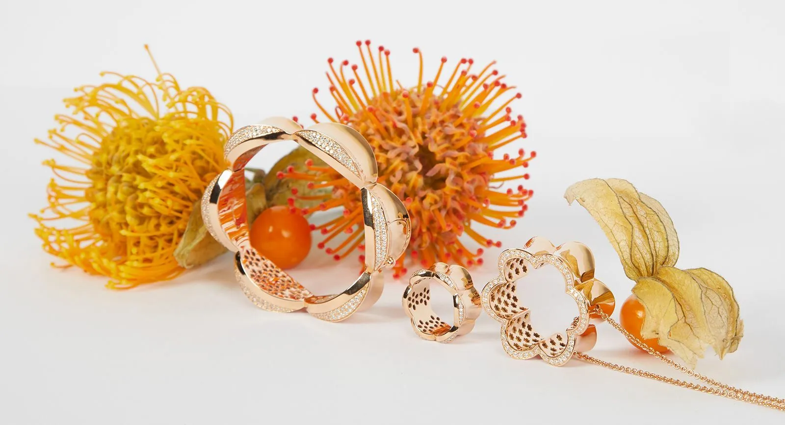 The brand’s signature design is a jewelled invention of sorts, incorporating security to ensure it can’t fall off, while also prioritising lightness, elegance and a style that can be translated across matching rings, earrings and bracelets. In addition, the Fullord can be worn as a pendant, making it a more versatile jewel. The brand’s design style is rooted in natural, earthly inspirations, such as lotus flowers, butterfly chrysalises and Thibaud’s African heritage.