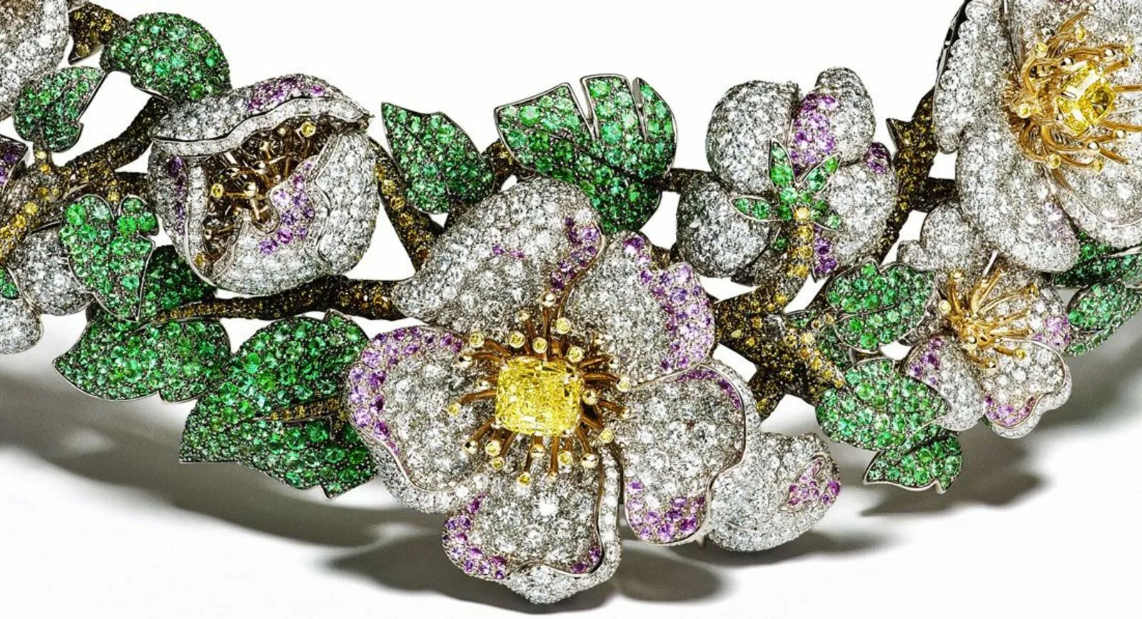 Giampiero Bodino Simonetta necklace from the Primavera collection. It features five intense and vivid yellow diamonds of 6.43 cts in total, white and cognac diamonds as well as pink sapphires and emeralds set in white and yellow gold. Photo credit: Laziz Hamani