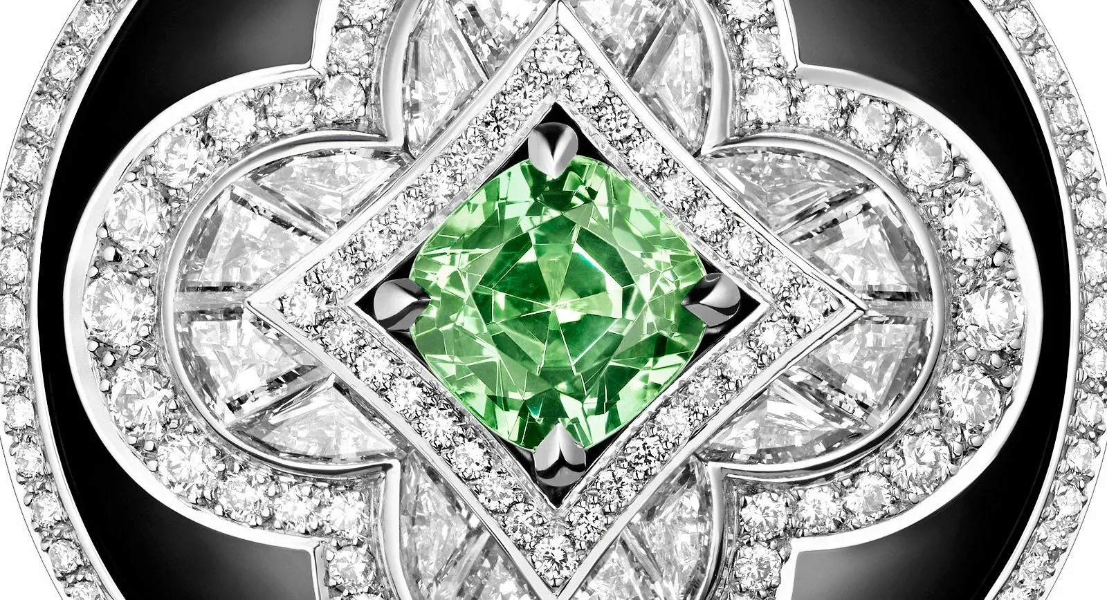 As is the case with the previous High Jewellery collections by Louis Vuitton, in the centre of each piece is a unique gemstone. Here, an intense, bright 7.13-carat mandarin garnet, a sparkling, glistening 53.01-carat black opal, and an extremely rare 29.75-carat garnet recently found in Merelani, Tanzania become the focal point of a design. Incidentally, Merelani stone’s bright yellow-green tones are in great to the usual deep green hues of tsavorites. What’s more, the garnets from the new mine radiate with a sort of inner glow, making them visible even in dim light. This extremely rare property is generally inherent only to the tourmalines of Paraíba. One of the key sets was the necklace and earrings with flowers carved from white opal, and teardrop-shaped spinel pendants. It is hard to find the words to describe the rare reddish-pink colour of spinels. Their tone was so incredibly rich and bright that I was not surprised when I found out that all three gems were cut from the same mineral.