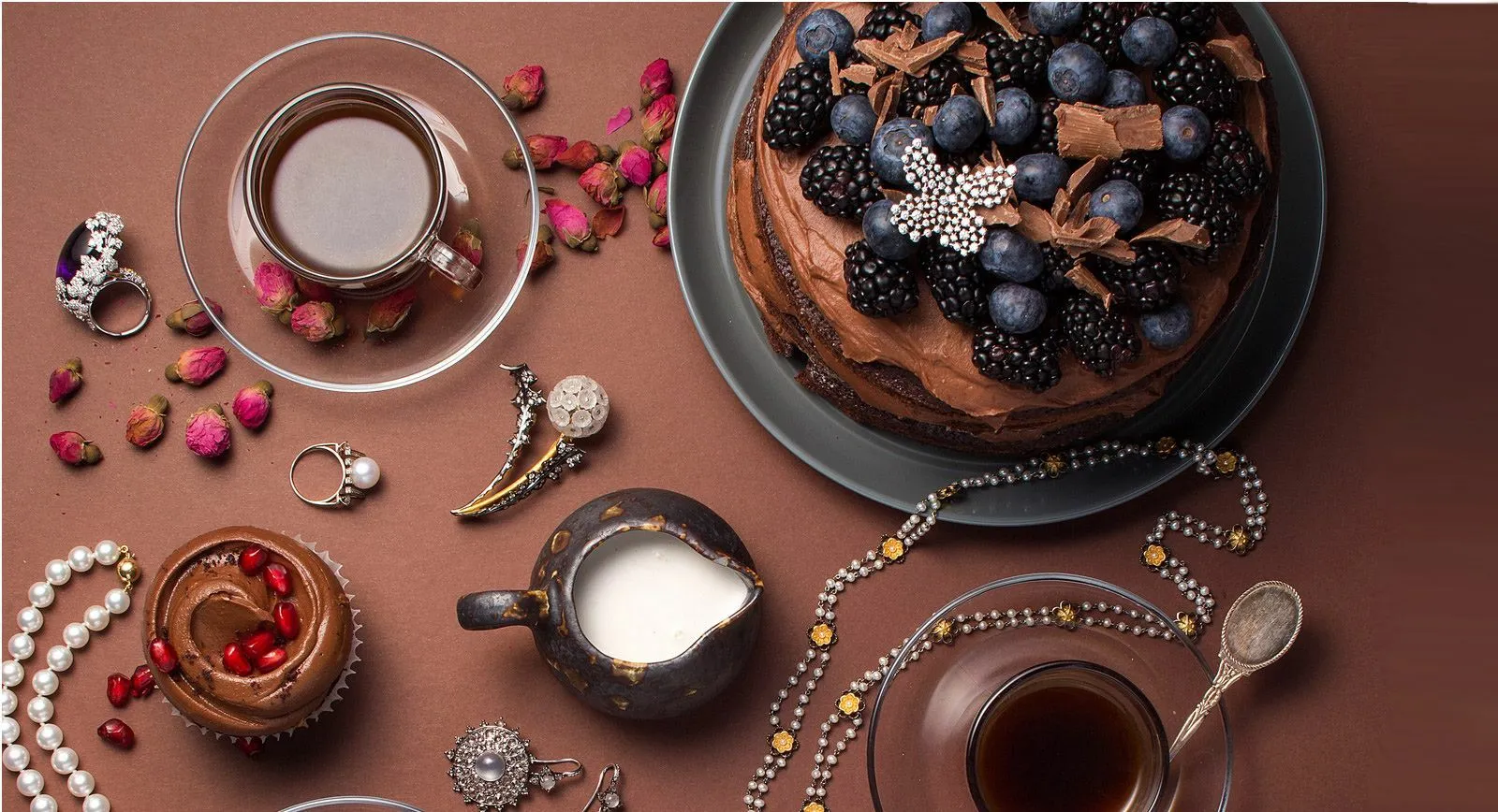 Ah, summer! It’s time for bright colours, juicy fruits, joyful moments and…playful jewels. When I am on an enticing trip, I like to move away from the well-known tourist paths and explore the hidden treasures of the city. This time, I came across a cute little bakery that opened its doors for me – welcoming me in and coaxing me to indulge in some mouth-watering delights. A tablecloth that borrowed its hues from delicious coffee, a tiered cake smothered in gooey chocolate and sprinkled with blueberries, desserts sprinkled with pomegranate seeds. I want to stay forever in this moment!