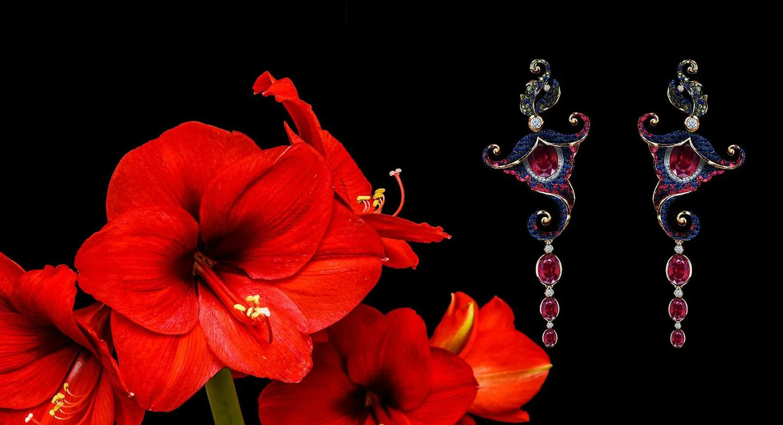 I feel it is clear from first glance that the key design choice behind the set was the use of brightly coloured gemstones. By a stroke of good fortune, the gemstone buyer at Jewellery Theatre managed to find a unique crop of spectacular Burmese rubies, with the finest colour grading, “pigeon blood”, and a total combined weight of more than 90 carats. I cannot stress enough that it is a true rarity that so many rubies are matched in colour and tone! Rich in their hue, red gems call to mind perfectly the scarlet petals of the wild amaryllis, a flower which the designers first laid eyes on while on a vacation in South Africa and chose to adopt it into their work.