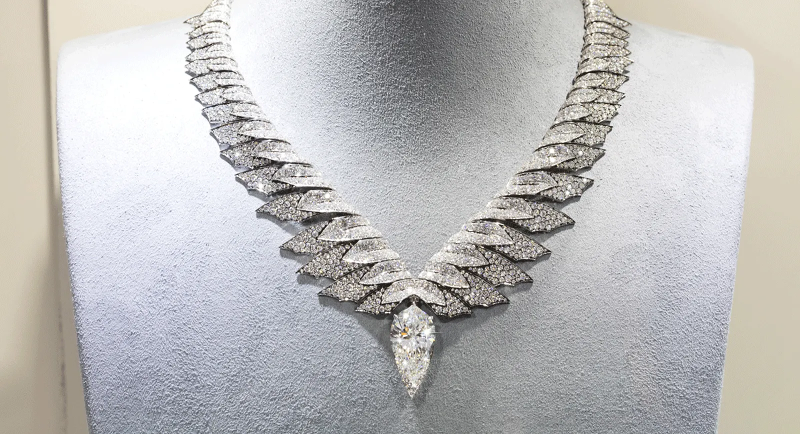 Now let’s talk about jewellery. First of all, I want to talk about an Arunashi bracelet with a Paraiba tourmaline cabochon of 75 carats. It left visitors to Couture speechless and flooded social media with its beautiful neon light. Another attractive gem was the 26 carat kunzite in a diamond encrusted chain necklace by Hammerman Brothers.