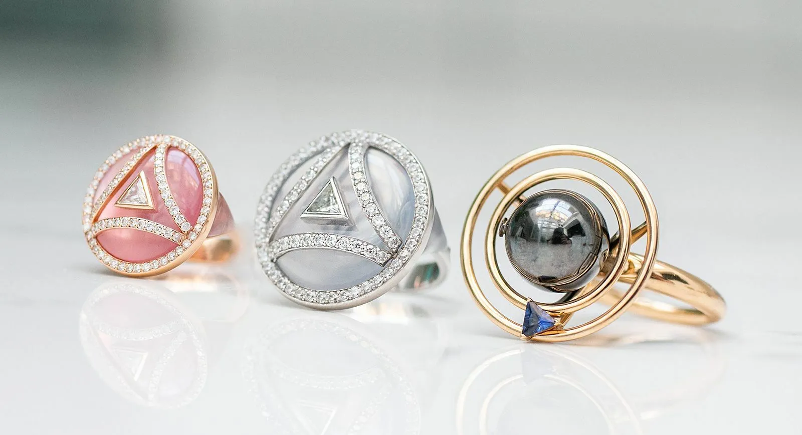 Maya Gemstones ‘SONYA 2’ rings with pink quartz or grey quartz and diamonds in 18K yellow gold and white gold respectively, and ‘SONYA 1’ necklace with pink quartz and diamonds in 18K yellow gold