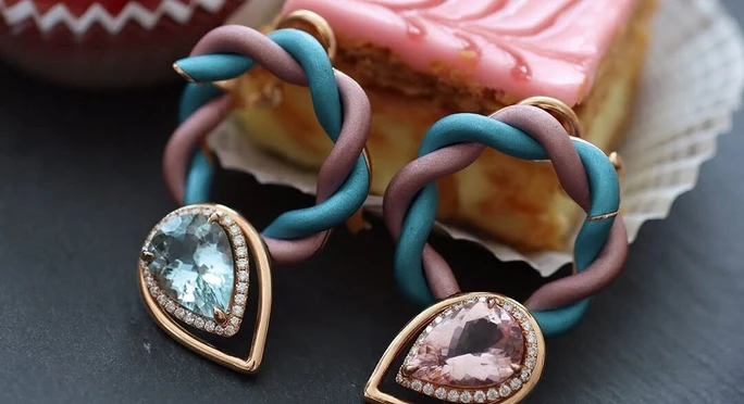 Katerina Perez wears the Mayiana Amour Pastel earrings (left) with a 3.09 carat pear-shaped morganite, a 2.96 carat pear-shaped aquamarine and diamonds set in 18k rose gold and pink and blue aluminium, shown here alongside the matching ring and bracelet