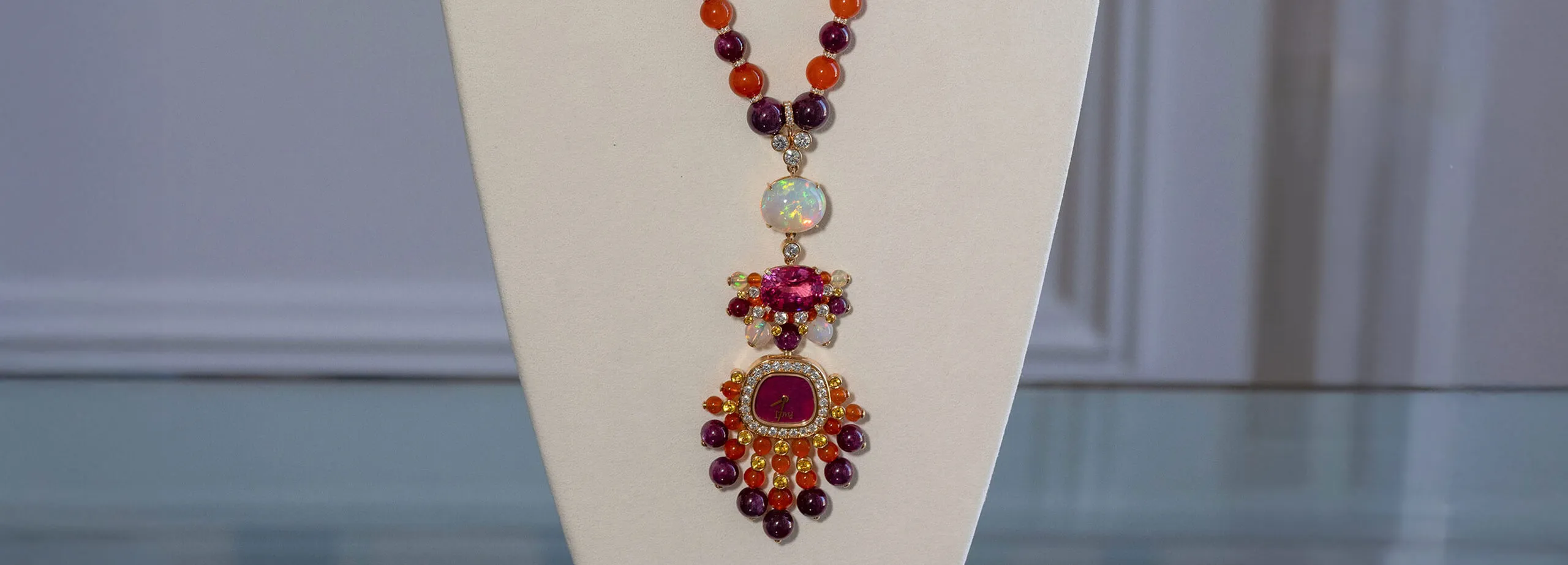 Piaget's legacy of transformable design is revisited in a new Watch Swinging Sautoir. A signature silhouette first introduced in 1969, it has been reimagined in a bold, high-colour palette of ruby root, garnets, white opal and spinel. The handmade chain is intentionally left visible—a deliberate contrast to the traditional high jewellery impulse to encrust every surface with gems. True to Piaget's love of ingenuity, the watch element can be detached with a one-click mechanism and worn on a strap, transforming the necklace into a standalone timepiece.