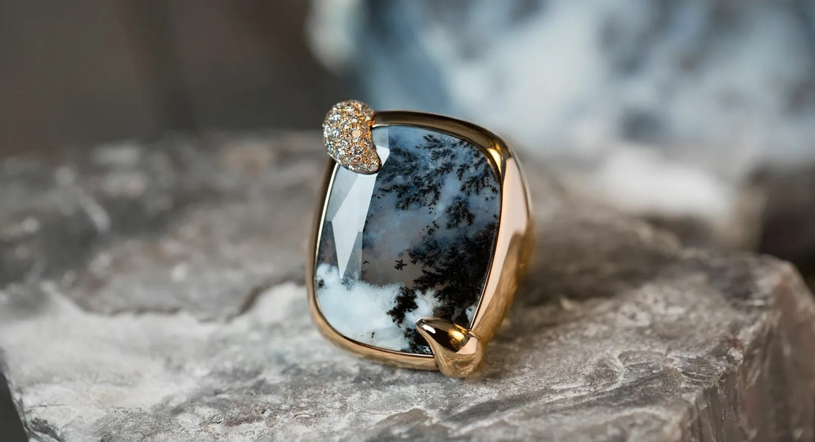 Each unique ring and pendant from the Ritratto 50th Anniversary Special Edition collection has its own name and personality. ‘Out of Africa’ features an agate with pattern resembling blazing hot sun, ‘Stormy Weather’ displays picturesque dendritic agate with tree-like inclusions, ‘Le Grand Bleu’ of magnificent blue colour is embellished with chrysocolla and ‘Caramel Dream’ looks good enough to eat with a sparkling orange garnet in the centre. “There is a ring called the ‘Secret Garden’ as it featured green zoisite with red ruby inclusions that together create an impression of the trees and flowers in a garden. The claws of each ring are a part of the design, reinterpreting the functional element of jewellery. We selected a huge variety of incredible mineral stones with inclusions and veins which add to their beauty,” says Vincenzo.