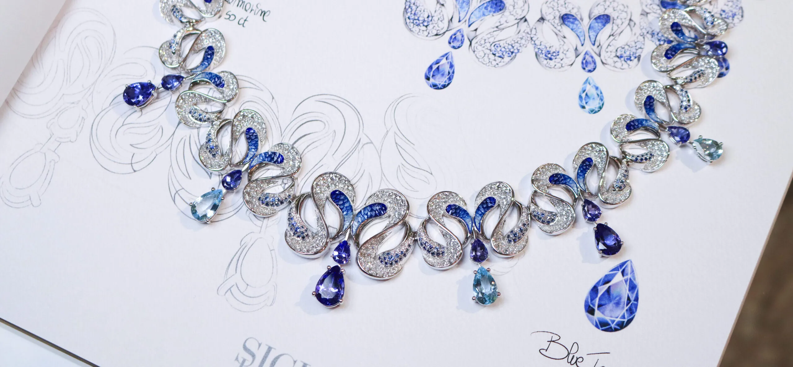 At Haute Jewels Geneva earlier this year, SICIS showcased its white gold Icon collection, one of two new capsule ranges that continue this tradition of blending micromosaics with a palette of coloured minerals. What appears like an ocean wave motif at first glance is actually a sculptural interpretation of the letter ‘S’ that appears in all four Icon pieces. These interlocking swirls form the foundation of a necklace and bracelet, the former dripping with pear-shaped tanzanites and aquamarines. Overall, the Icon collection has an organic composition that feels effortless and calming, especially when emphasised with an ombré selection of blue sapphires, tanzanites, diamonds and a gradient of blue micromosaics. The tesserae featured here have a custom-created diamond shape, which cleverly accentuates the subtle water-like flow of the repeating motif.