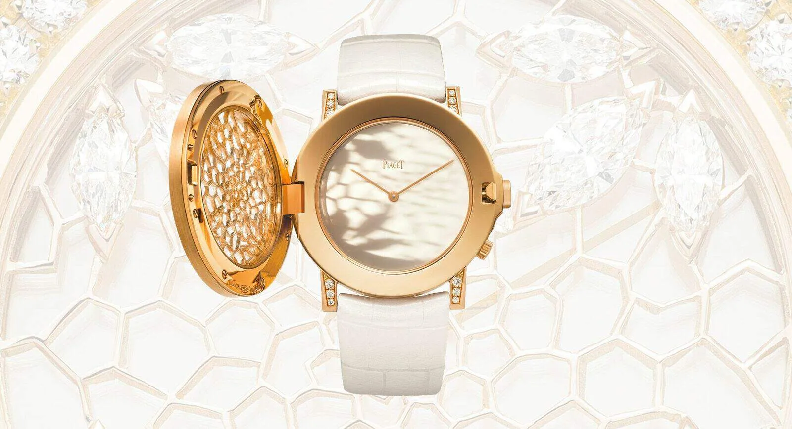 The model Altiplano Double Jeu with its two superimposed casings has been released as a limited edition of 8 copies. The top module is decorated with an exquisite gold pattern and encrusted with 12 marquise-cut diamonds with a total weight of approximately 1.6 carats. A special button opens the patterned case to expose the minimalist design of the white dial and hands, which work in unison with a hand-wound 430P movement. The body is made of 18 carat rose gold with 52 round-cut diamonds weighing a total of 2.3 carats.