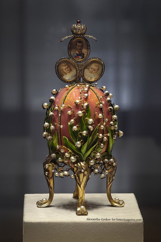 The “Lilies of the Valley” egg, made in 1902 for Nicholas II (again for his wife Empress Alexandra Feodorovna) is especially symbolic. The pink colour signifies the Tsar’s devoted love for his wife and the lilies represent female purity. This egg was made in honour of their two daughters, Princesses Olga and Tatiana. The ‘surprise’ inside is a mechanism with a triple frame which rises from the bottom of the egg when you turn the small lever to reveal three scrimshaw watercolours.