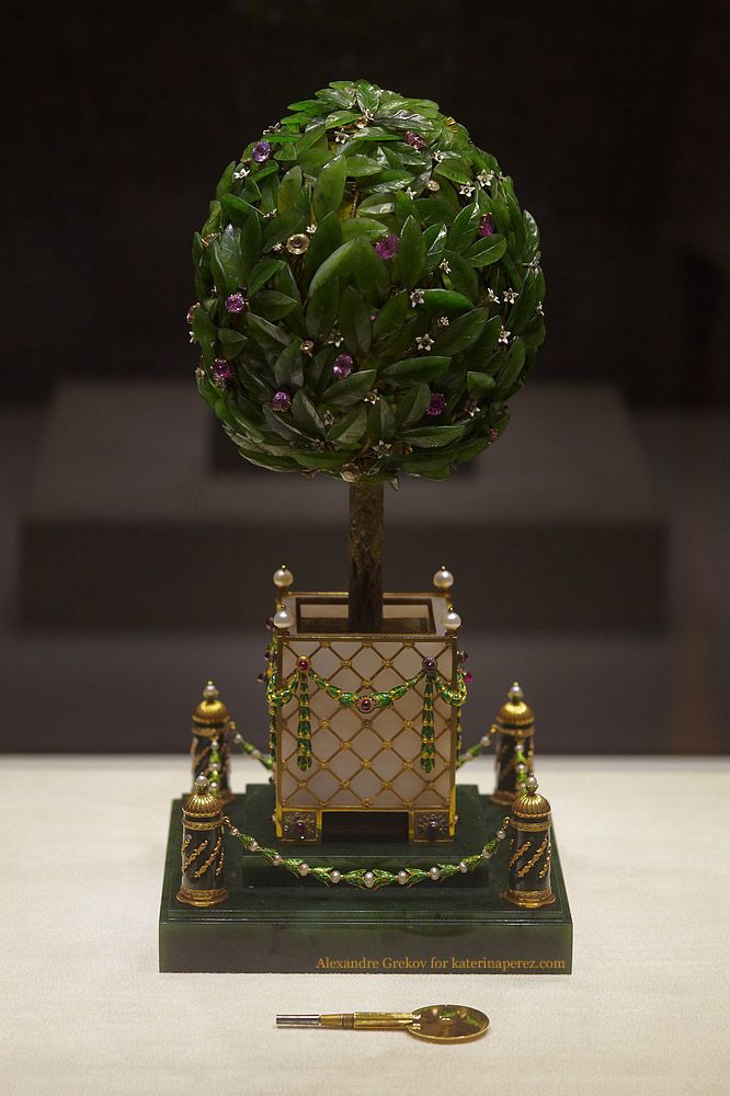 The “Orange Tree” egg was also made in 1911 at the bequest of Dowager Empress Maria Feodorovna. It appears to be more of a symbol of an egg as it depicts the crown of a tree. 325 jade leaves were individually cut from Carl Fabergé’s favourite ornamental stone: Sayan jade. The trunk of the tree and the soil are made from different colours of gold, the pail from Mexican onyx and the plinth is also made from Sayan jade. This work of art is dappled with citrine quartz, almandine garnets and rose cut diamonds. Its ‘surprise’? Unfortunately you can’t see it in the photograph. On the crown is hidden a bird and on the back there’s key which works the mechanism.