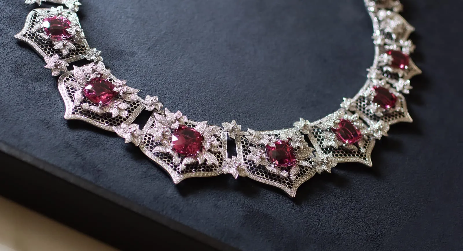 CC: It’s also one of my favourite pieces! It’s crafted from white gold and adorned with lace-like flowers and diamonds. At the heart of these blooms are exquisite pink tourmalines, lending a subtle touch of colour that enhances the necklace’s elegance. To me, this collection serves as a profound symbol of light, freedom, art, and regal authority. Born during the Victorian era, lace jewellery combines the intricate artistry of lace craftsmanship with the fine delicacy of hand weaving. The hollow carving technique bestows a finishing touch of softness and allure to these creations, perfectly adapting to the curves of the body. Crafting the Iris Lace Necklace, with its cushion-cut pink tourmaline and detailed gold lacework, requires 1,800 hours of dedicated craftsmanship. It is a testament to our unwavering commitment to perfection and artistry.
