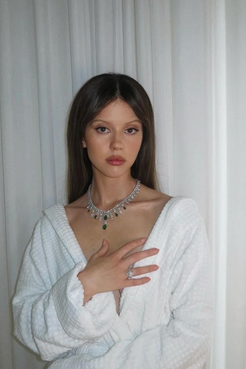Mia Goth photographed ahead of the Venice Film Festival 2025 red carpet wearing an archival necklace by Tiffany & Co., set with diamonds and emeralds in platinum and 18k yellow gold