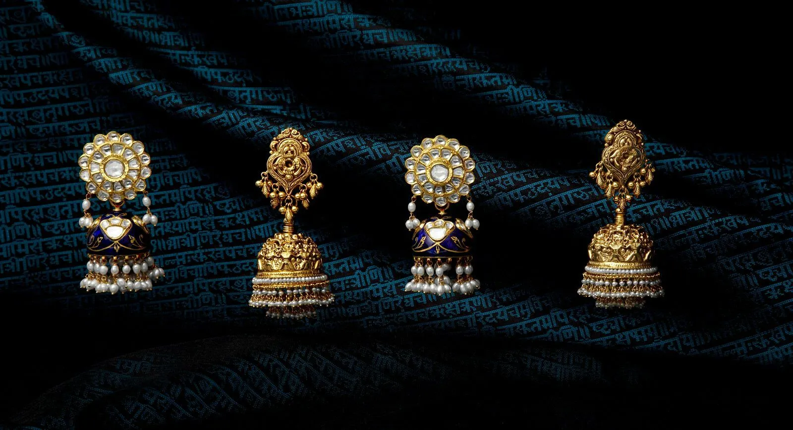 A bright blue-enamelled torque and bangle (hasli and kada) caught our eye. Adorned with delightful floral motifs in meenakari (enamelling technique) and crafted in 22k yellow gold, the design spoke of strong Indian influences. Snugly ensconced on the torque and matching bangles, tiny pearls and uncut diamonds (polki) added to the jewel’s beauty. Interestingly, the polki jewellery is one of the oldest techniques in India and was introduced by the Mughals many centuries ago. They are often combined with sapphires, rubies and emeralds that give them a touch of regal. After spending a good amount of time lusting after the fabrics and handcrafted fine jewels, we handpicked a few for our photo-shoot. Besides the torque, we were enamoured by the traditional jhumkas (dome-shaped chandelier earrings), both the enamel polki version and the ones crafted entirely in yellow gold.