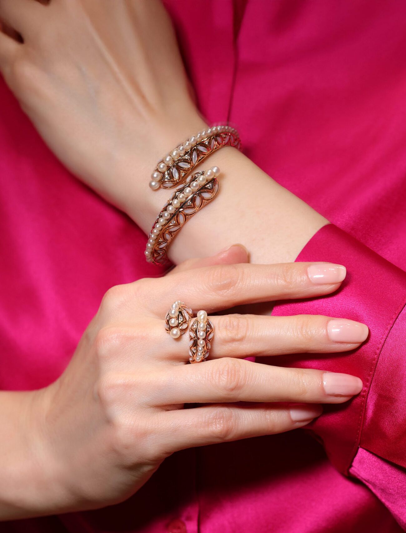 The Al Mahmood Signature bangle and ring in 18 rose gold, with natural Bahraini pearls, mother-of-pearl and diamonds