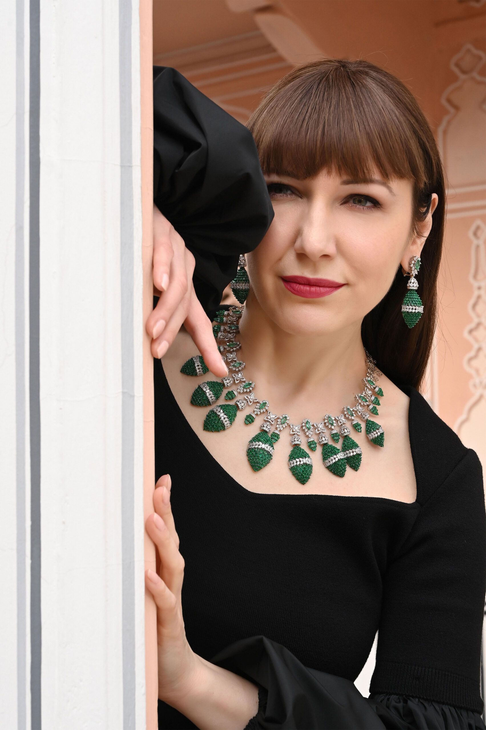 Katerina Perez wears a necklace and matching earrings from the Diviano Plume Collection, featuring a proprietary three-dimensional layout of marquise-cut emeralds and diamonds, set in 18k white gold