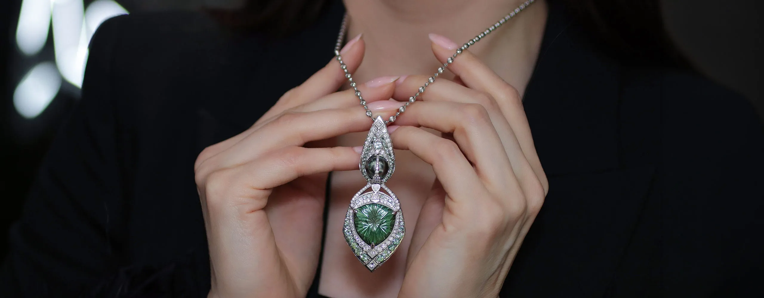 The striking one-of-a-kind Exuma pendant with a fantasy-cut cuprian tourmaline of more than 30 carats, diamonds and a black pearl set in white gold