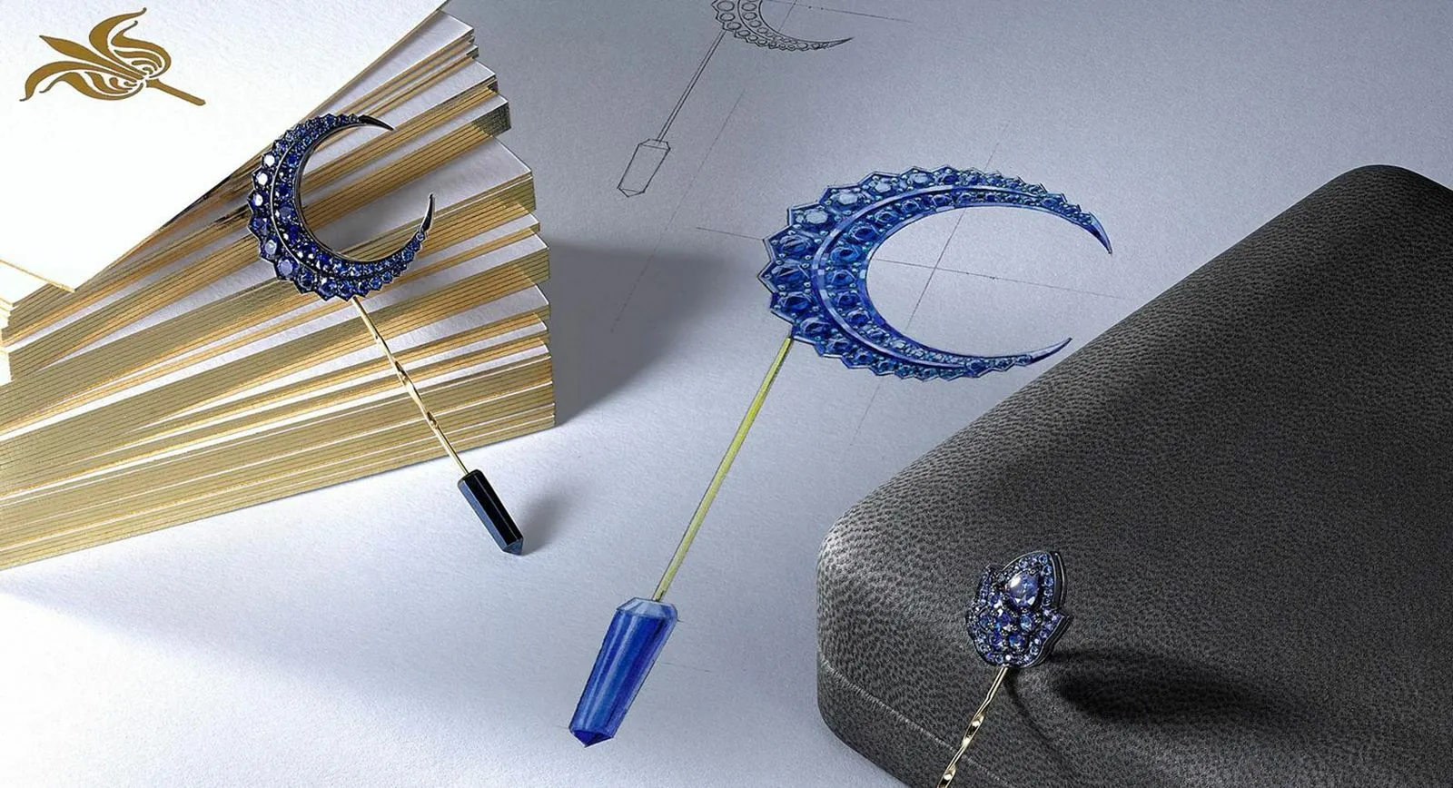 Rolls Royce Dawn is the epitome of luxury and refined taste. Its vivid blue hue prompted the tinted palette of Ana de Costa’s jewellery, which is made from white gold with blue lacquer and encrusted with sapphires. The mini collection includes three pins, one in the shape of the moon, the second resembling the stars and the final one an abstract motif from Ana’s Spiritual Henna collection. The decorative elements in celestial forms were not chosen haphazardly: in the 1900s there were no “gadgets” to assist in orientating the cosmos, and therefore people relied on the stars, the sun and the moon. And, after all, who doesn’t know that Charles Royce, in addition to his interest in the car industry, is great fascinated by aviation?