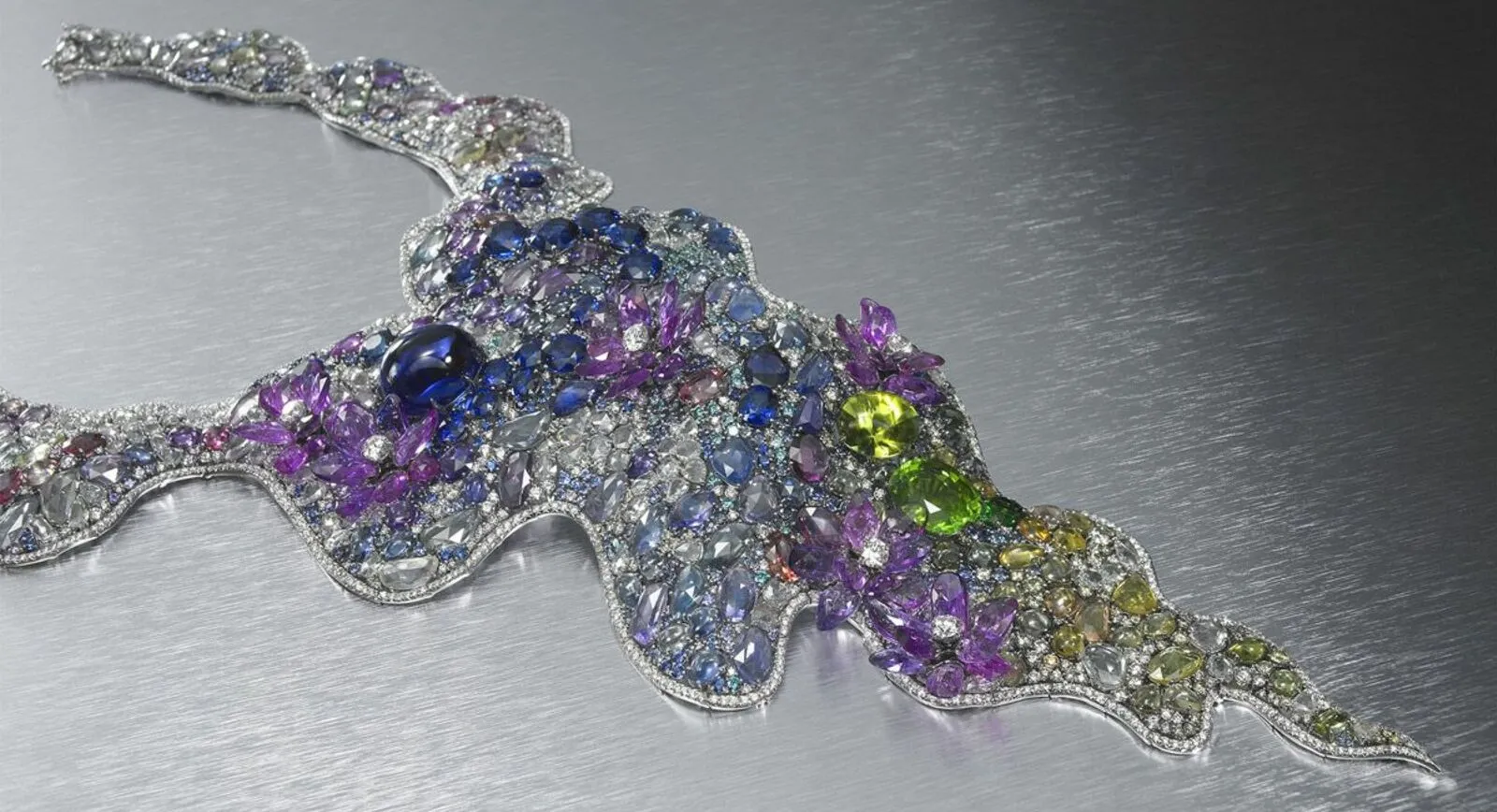 Anna Hu Necklace inspired by Claude Monet’s Water Lillies featuring one 5.22 cabochon tanzanite, 11 sapphires weighing 41.5 carats, tsavorites, tourmalines, morganites, alexandrites, Paraiba tourmalines, natural pastel-colored sapphires, white, pink, and silver-gray diamonds, for a total of 1,590 gemstones weighing 630.17 carats, hand set in 18-karat white gold