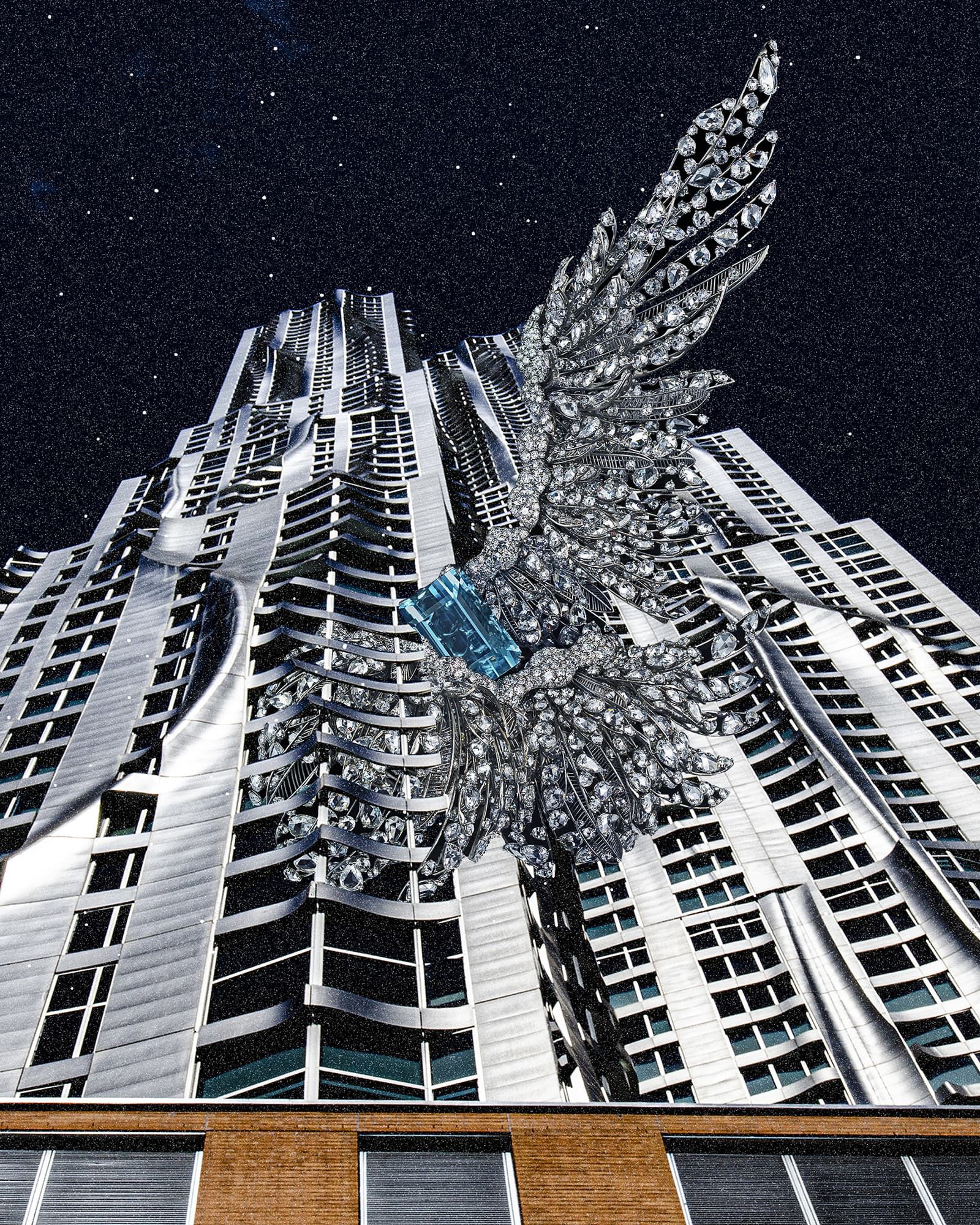 Elsa Jin Feather brooch with an 86.57 carat aquamarine and 200 carats of diamonds set in titanium