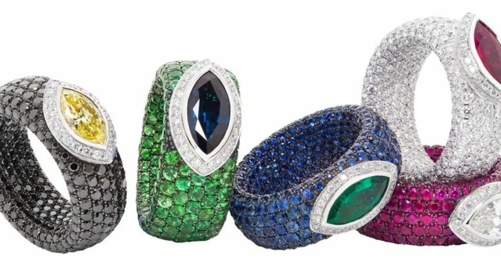 Avakian rings from Cache collection with emeralds, sapphires, rubies, black and colourless diamonds