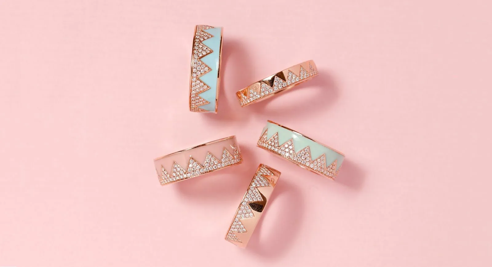 In the first you will find various jewels made of red gold and embellished with enamel in pastel shades – pink, blue and green – as well as items with no enamel decoration. A zig-zag pattern, half of which is encrusted with pavé set diamonds, adorns the rings, earrings, pendants and bangles. In the B2 you’ll predominantly find rings and earrings made of white or rose gold, with and without diamonds. Everyone can make their own bejewelled combination with rings either in zig-zag shapes or with the usual round rim, made from precious metals and decorated with stones.