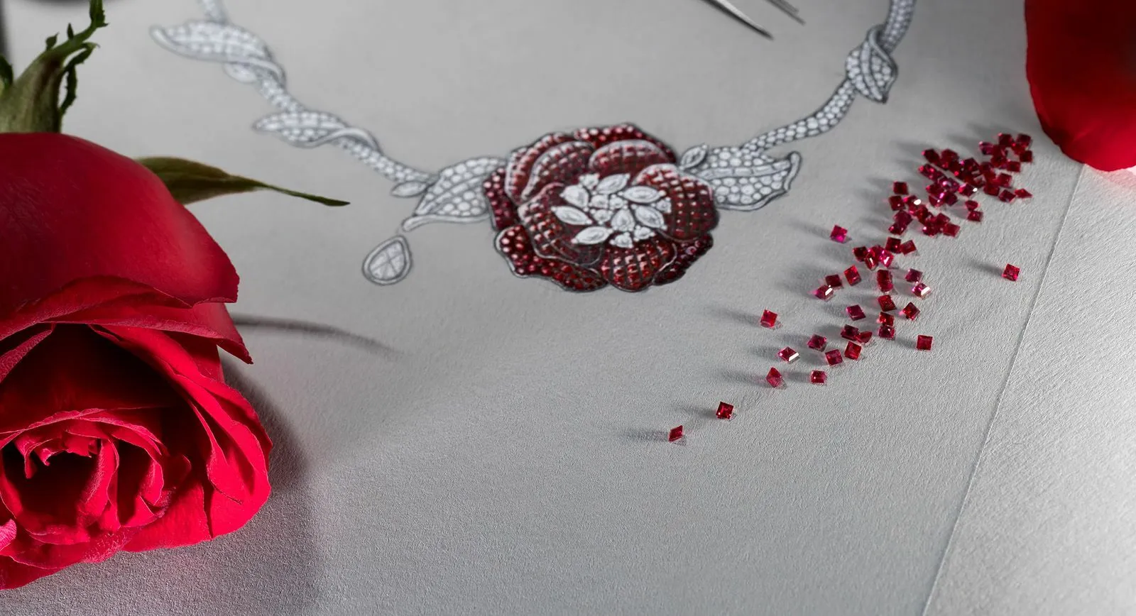 Rose Red was lively and cheerful, so we used the invisible setting to create her luscious rose. For us this jewellery technique is always the best way to exalt the beauty and the natural movement of flowers. – Klaus Stenzhorn