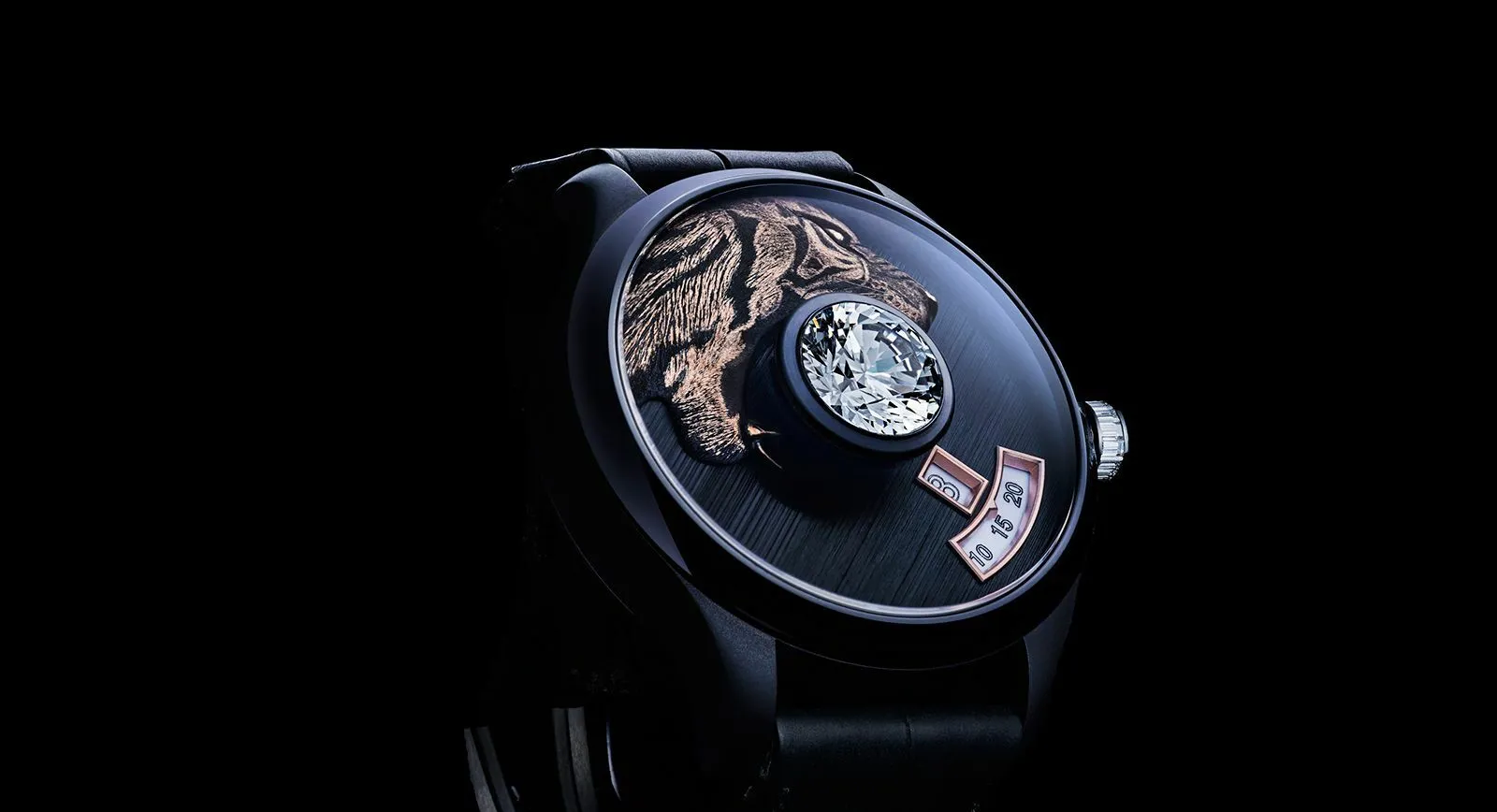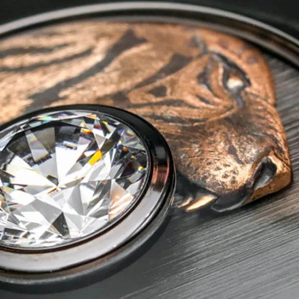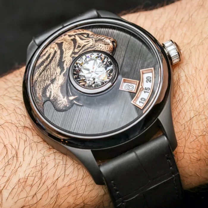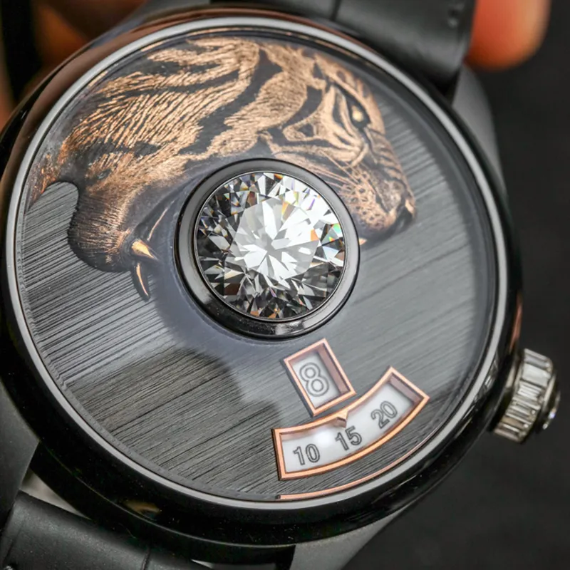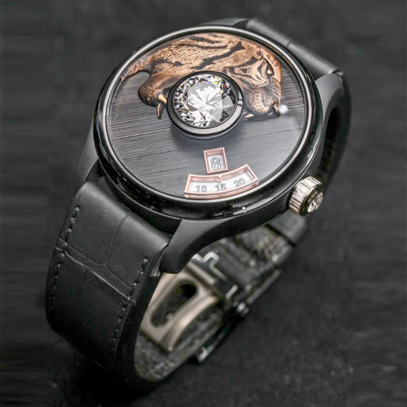 The founders of the French brand de Tournemire specialise in the art of jewellery making, something which they have decided to interweave into a line of watches. The watch brand offers a discerning public models with colourless round diamonds weighing no less than five carats, set in the very centre of a 44-millimetre dial. Its decoration is normally built around the central stone, like in the models with a tiger engraved in rose gold with a diamond in its teeth.