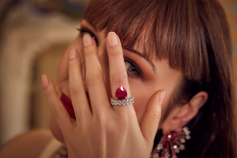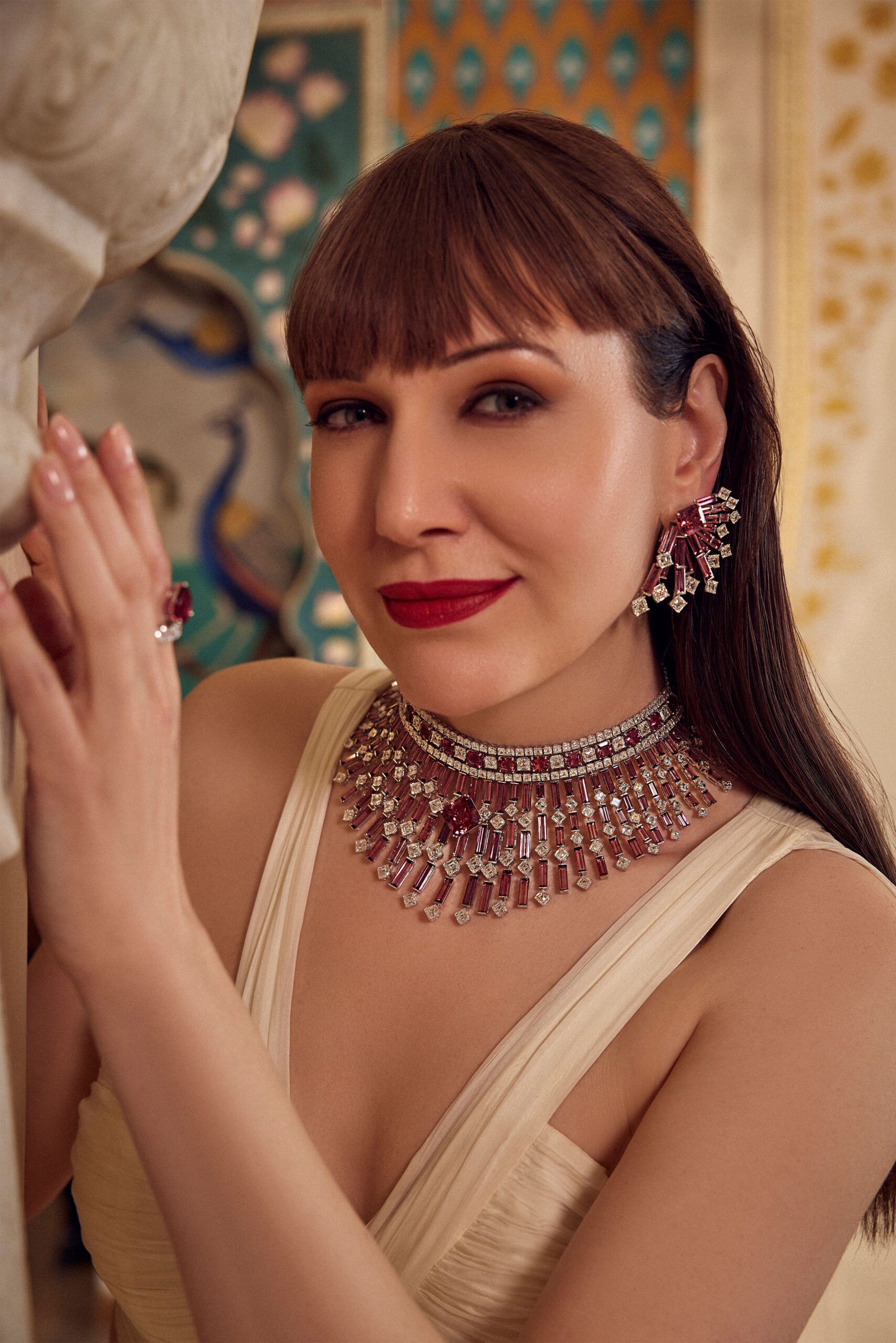 Defined by clean lines, precise detailing and graceful proportions, Katerina wears striking ruby and diamond creations by Delhi-based Hazoorilal Legacy Jewellers