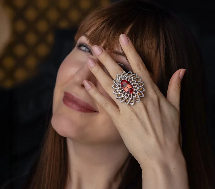 Finally, the Nacre necklace is all about monochromatic textures, consisting of diamonds, melon-shaped rock crystal beads, mother of pearl and cultured pearls in white gold. It can be worn in its long or in its short form, as a choker, as two pearl bracelets and as a brooch. “The concept at the beginning was to create a set of three necklaces that can be worn together or not,” Choisne explains. “We have a sense of opulence in this collection, so I love the idea that you can wear three necklaces all together. The choker is really a superb work of craftsmanship. The making of the gold metalwork took 2,400 hours.” Finally, there’s the New Maharani ring with a 1.60 carat cushion-cut diamond that can be worn with or without its jacket – a pair of lotus petal adornments on either side of the central motif.