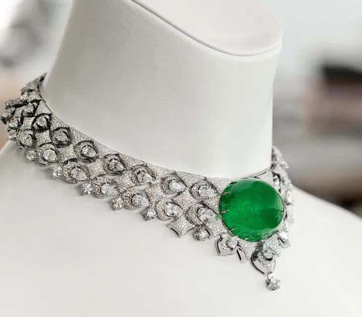 “The second way to reinterpret this story was to play on colour and no-colour,” explains Choisne. The transformable necklace – a scaled-down version of a 1928 sketch created for Bhupinder Singh – is set with nine Colombian cushion-cut emeralds with a total weight of 38.73 carats, while the matching firework-inspired earrings contain 58 drop emeralds with a total weight of 35.93 carats. “The necklace is totally supple, and you can detach the tie from the middle of the necklace and wear it as a brooch. I am obsessed with long brooches on men. Of course, it will be nice on a woman, but it’s stronger on a man,” Choisne says.