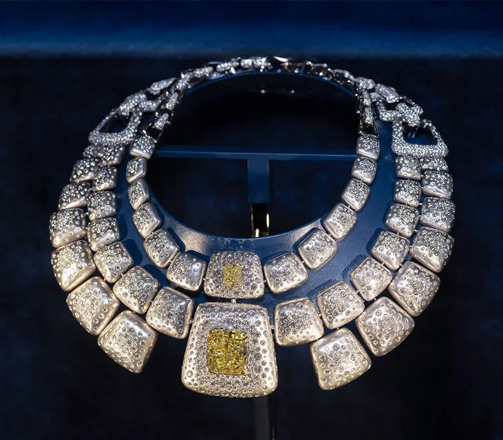 Consisting of a ring and three necklaces – the New Maharani necklace, New Maharani Cristal and the New Maharani Nacre – this set is an ode to diamonds, rock crystal and pearls. The former is a celebration of the lotus motif with a lace-like openwork of diamonds that sit in choker form around the neck and can be worn in three different ways. The white gold and diamond Cristal necklace was inspired by traditional Indian long necklaces and demonstrates the glyptics technique applied on rock crystal. It is set with five cushion-cut diamonds for 7.35 carats and can also be worn as a choker and a shorter necklace in the spirit of multi-wear.