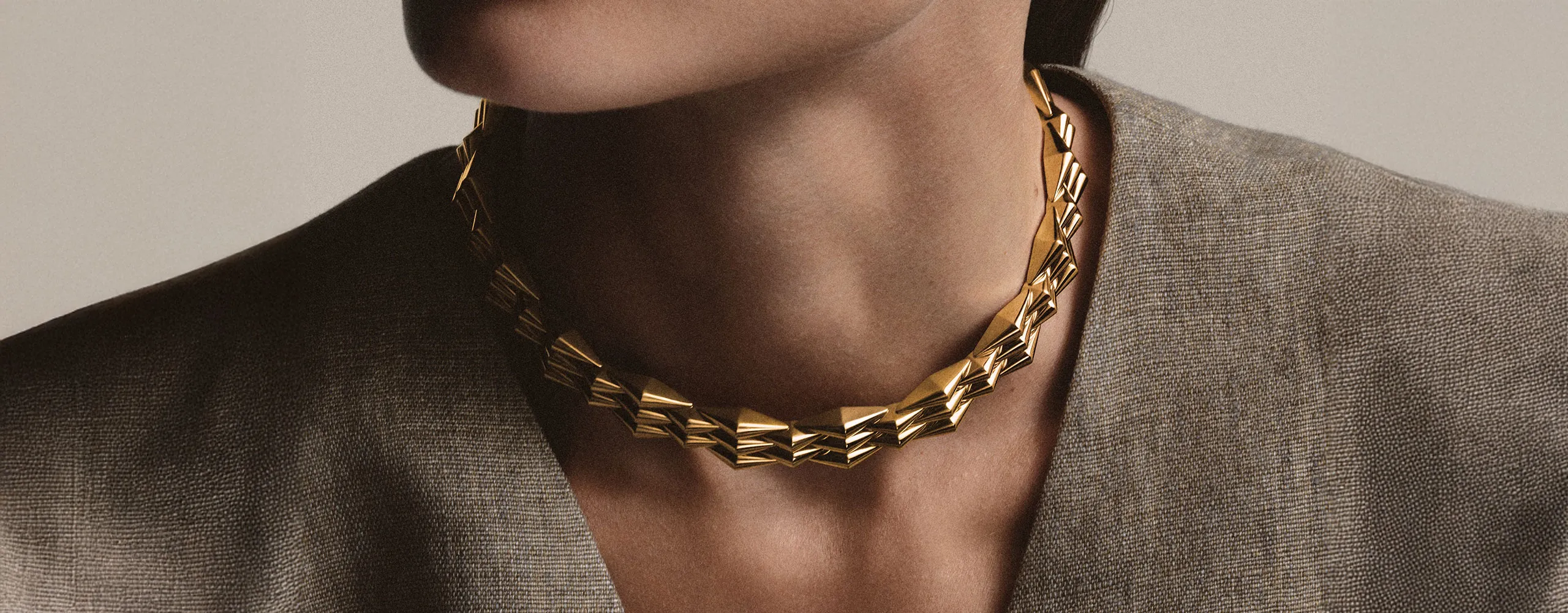 The first chapter is collectively named Vimini, with the new creations encompassing a necklace, bracelet, ring and two styles of earrings in 18ct yellow gold. Vimini translates as “wicker”, a nod to the woven construction that links rhomboid-shaped elements to create smooth, architectural surfaces of gold. Invisible flexible joints lend the pieces a beautiful suppleness. From above, they appear almost mechanical in their rhythmic modularity. From the side, the design softens, with faceted gold planes creating a subtle play of light and shadow.