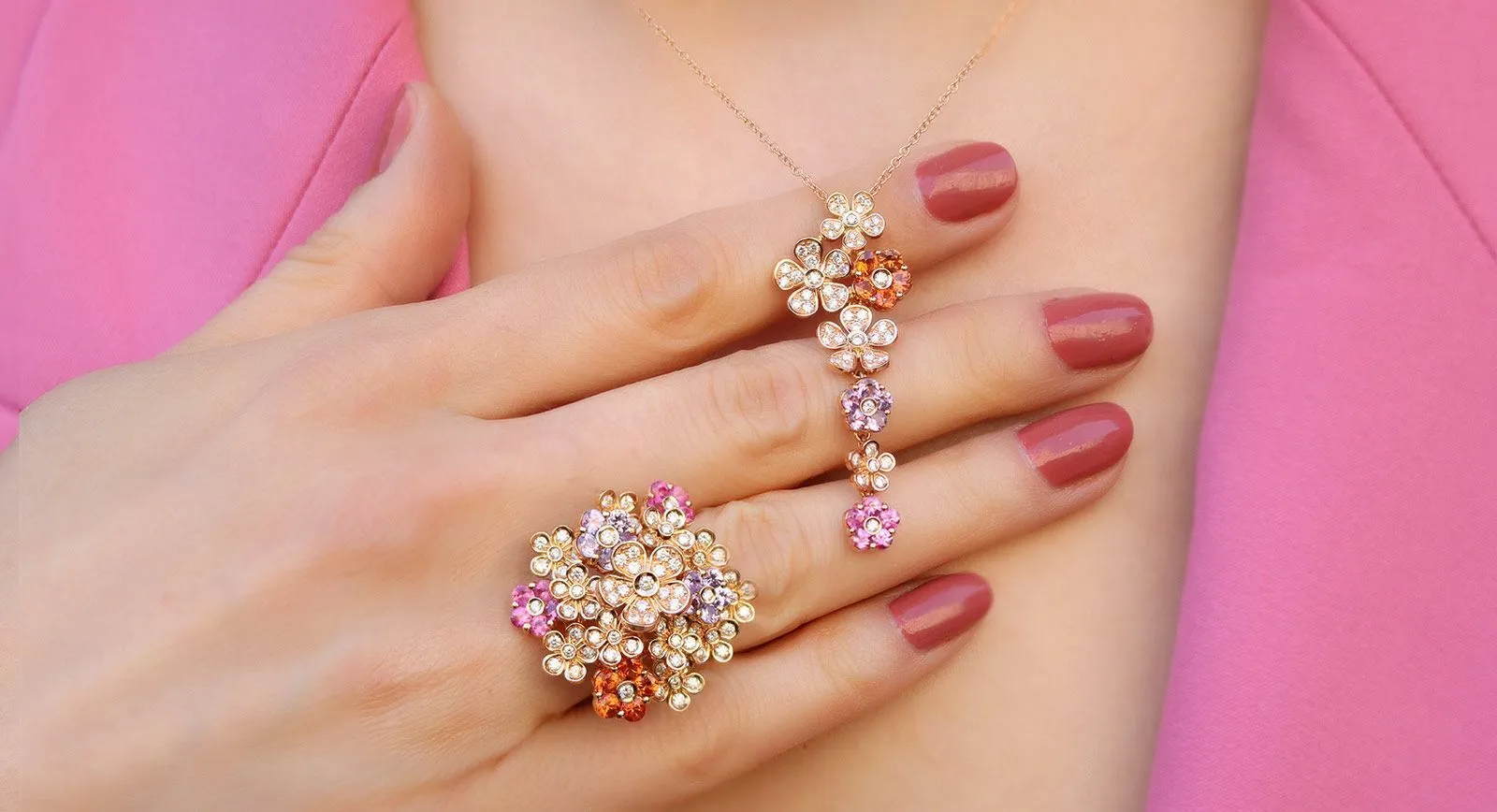 Katerina Perez wears the Cesare Pompanon Primavera Multi Flower ring and necklace with sapphires and diamonds in rose gold