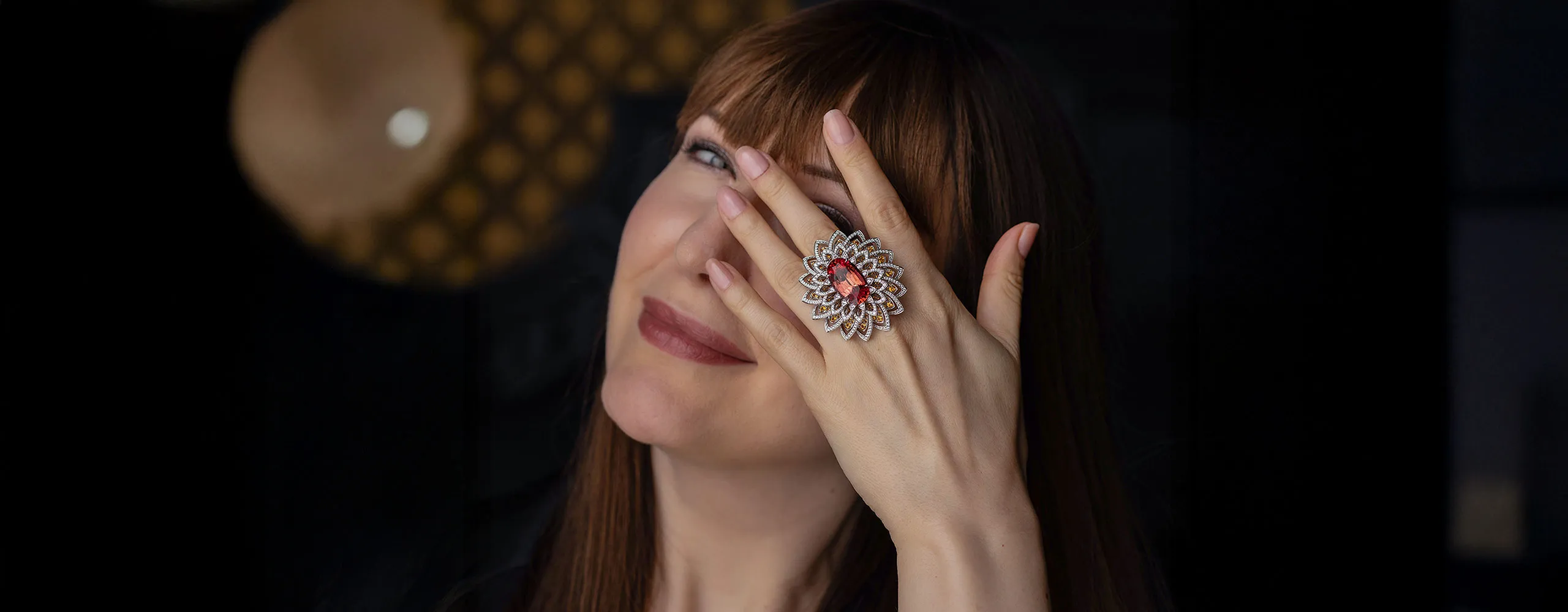 Katerina with the Dahlia high jewellery necklace from Jewels by Nature, Chaumet’s latest high jewellery collection