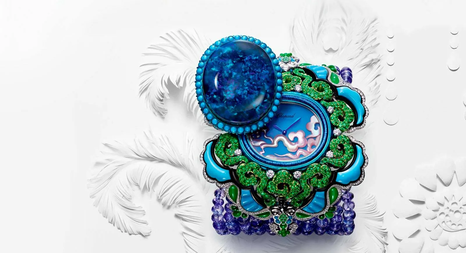 This year, the eponymous collection has been inspired by the vivid dreams and global travels of Co-President and Creative Director Caroline Scheufele. This has created a broad range of bright fantastical creations, of which there is no one overarching theme, but instead are tied together by their high quality, beauty and originality. However, one of the recurring aesthetic motifs certainly hints toward oriental colour combinations and forms: such as found in the orchid earrings, the secret opal timepiece and the feathered choker necklace.
