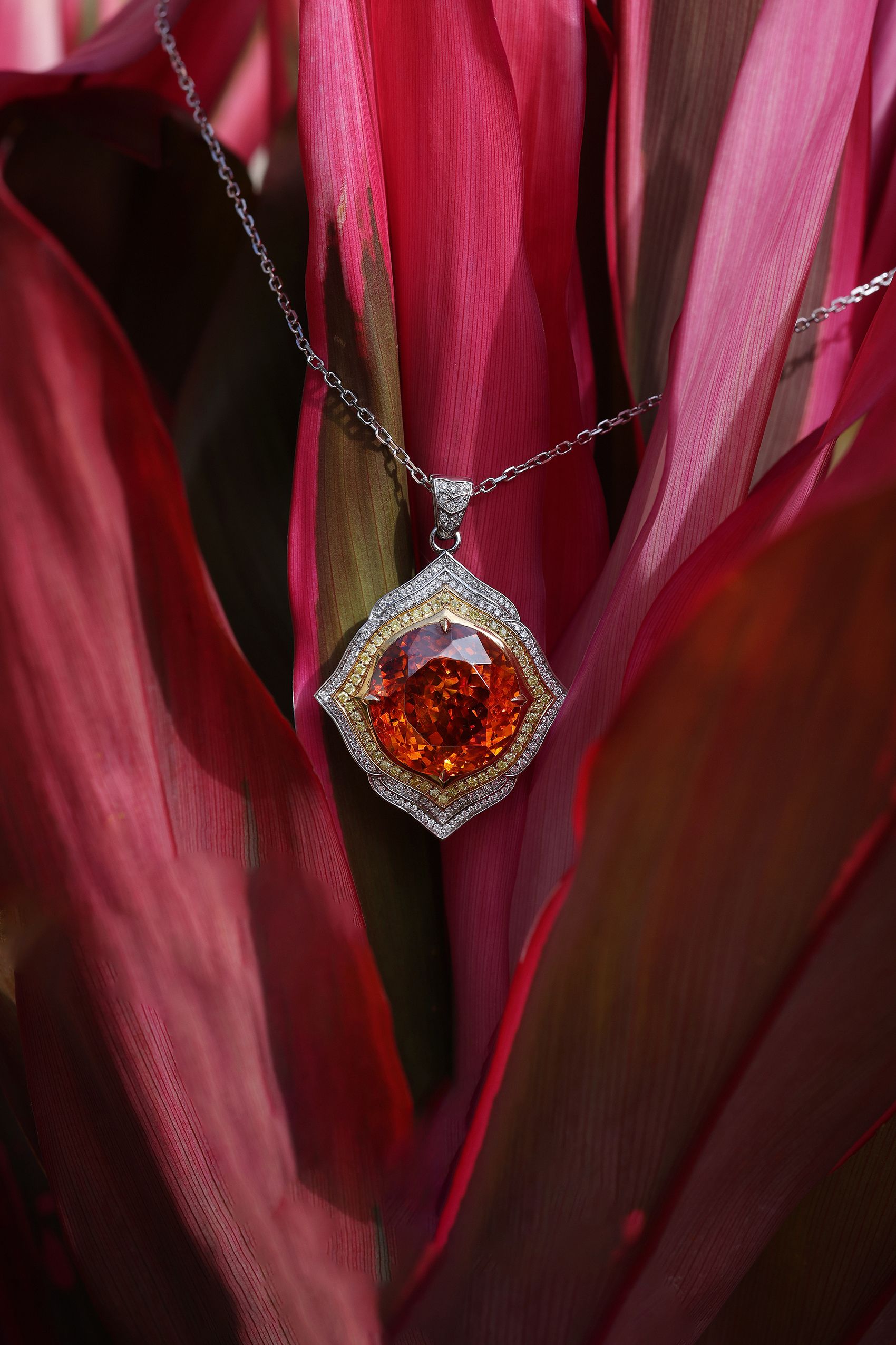 Chromia New York's speciality is rare and exotic gemstones like this 67.94ct Spanish Sphalerite, set in a pendant with white and yellow diamonds in 18k white and yellow gold