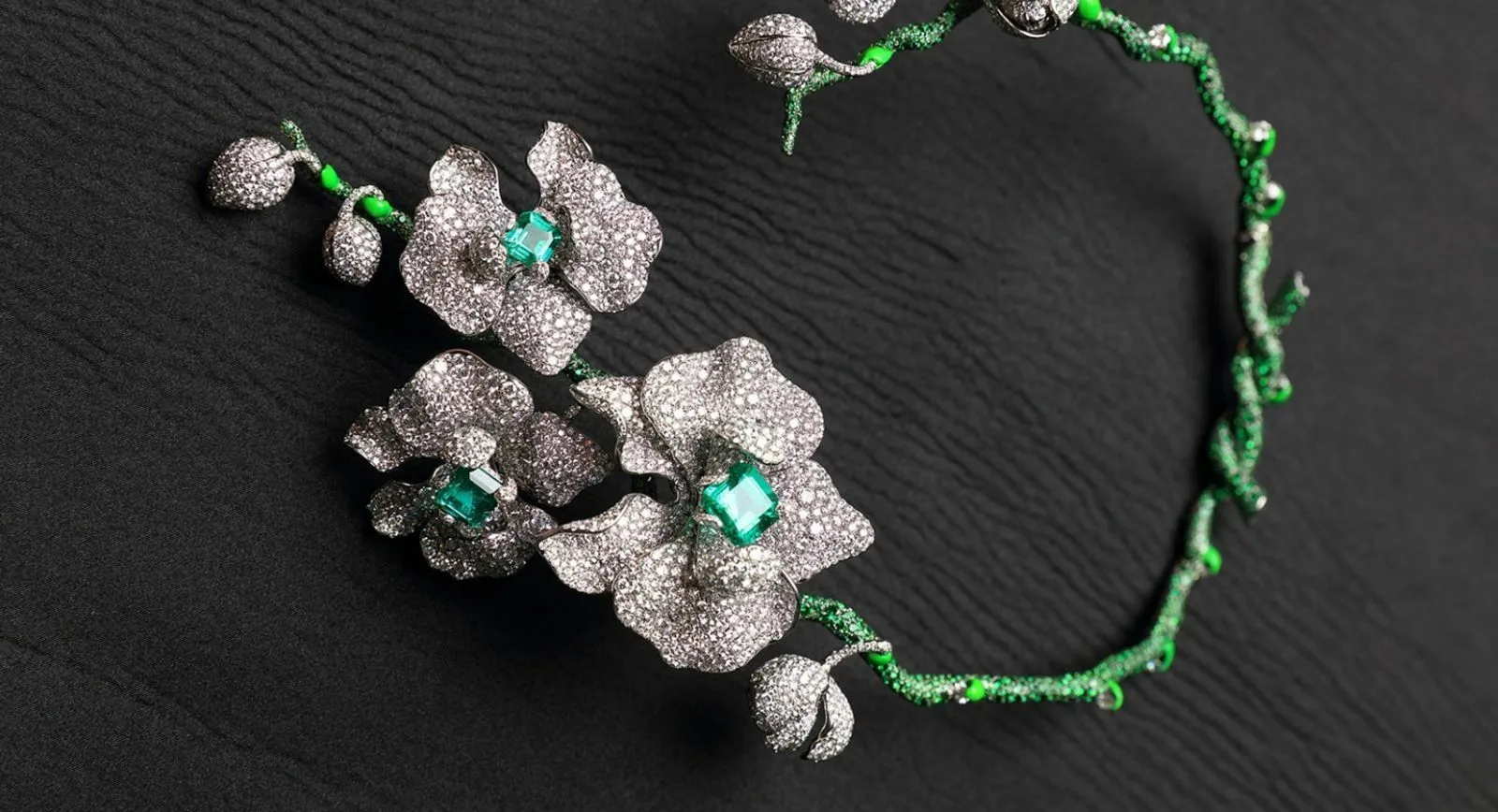 It took more than a fertile imagination to design this particular necklace, however – it also took a great deal of time. Diana spent two years to find the right stones to decorate the complex ‘Orchid King’ pendant, which has at its heart three rough emeralds weighing 6.2, 4.08 and 1.98 carats respectively, bordered by over 5500 diamonds and 2700 tsavorites fixed in a titanium and gold base decorated with enamel. As well as a necklace, the “Orchid King” collection includes a brooch, a choker or a hair accessory, providing the perfect touch of elegance for any occassion.