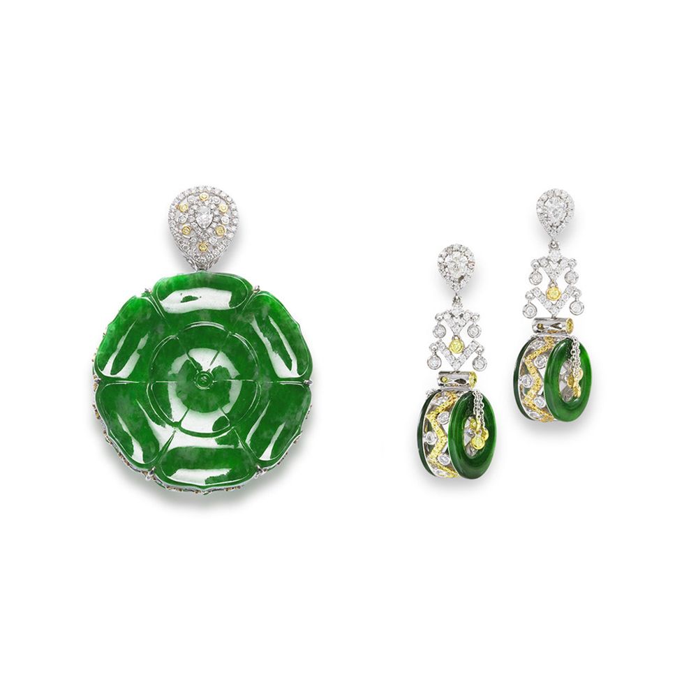 A jadeite, diamond and coloured diamond pendant and earrings suite with double-sided openwork. Jadeite plaques on the pendant are of intense green colour, each carved as a lotus. The pair of earrings en suite features jadeite white and yellow tint diamonds. Natural colour fei cui (jadeite jade) have no resin detected. Est. $ 10,000 – $ 15,000