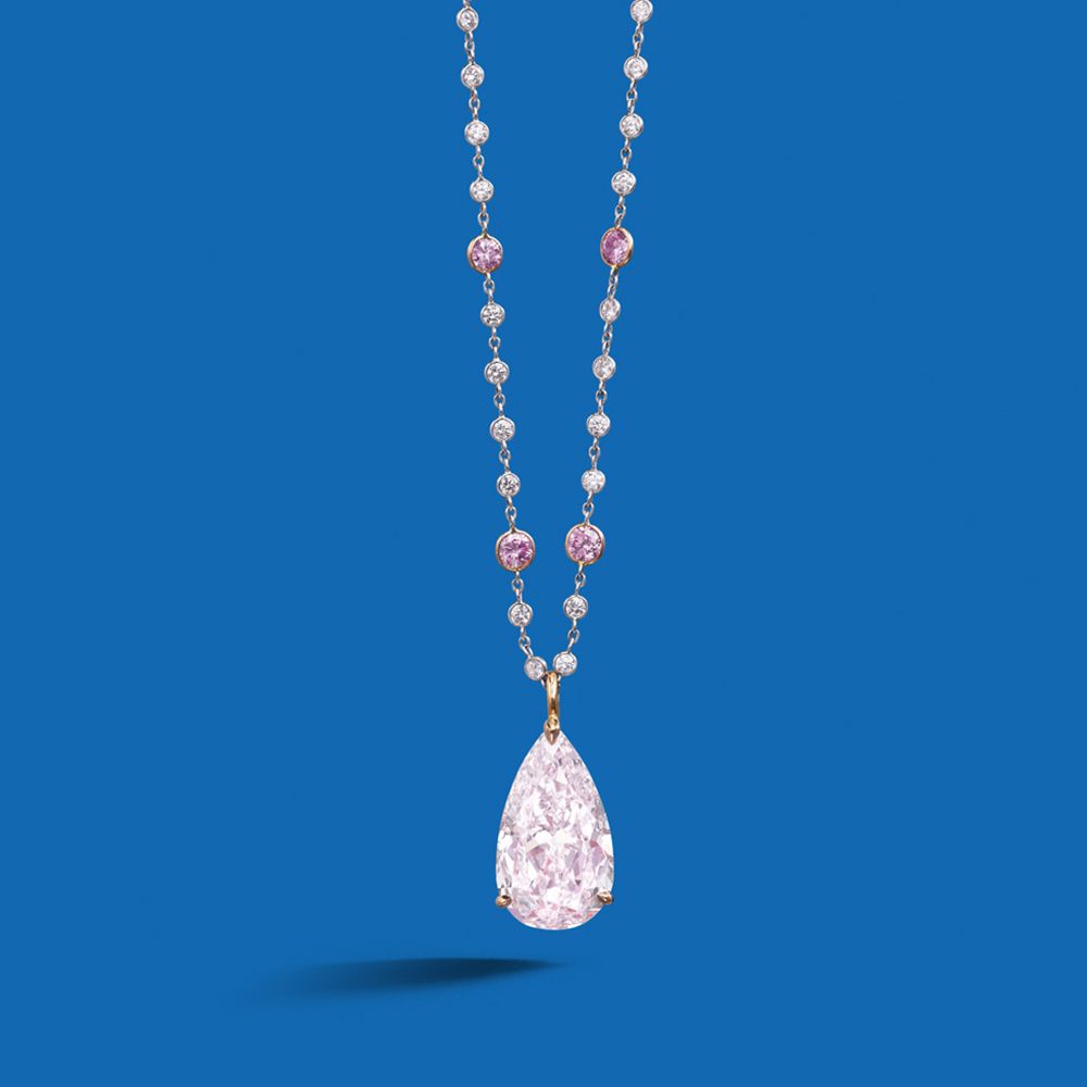 An important fancy colour diamond pendant. The pear-shaped fancy light purplish pink diamond, weighing 9.21 carats, suspended from a chain necklace accented by brilliant-cut diamonds of purplish pink tint and similarly cut colourless diamonds (approximately 3.15 cts total). Est. $ 1.5 million – $ 1.9 million