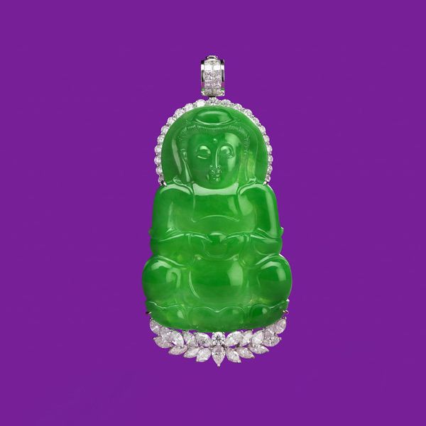 A jadeite and diamond ‘Guanyin’ pendant with fine translucent carved jadeite (no resin). ‘Guanyin’ of a rich bright green colour is meditating on a lotus throne, embellished by marquise, pear and brilliant-cut diamonds of approximately 7.60 carats total. Est. $ 350,000 – $ 450,000