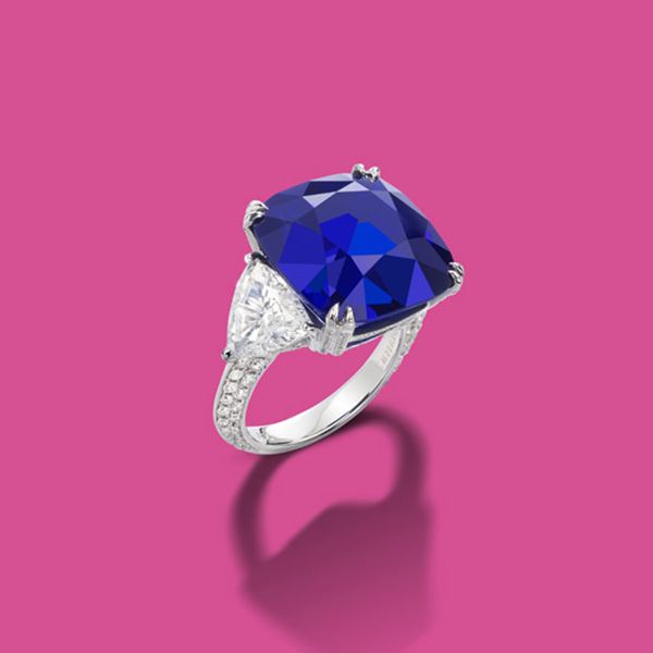 An important cushion-shaped sapphire and diamond ring. The Burmese sapphire is of natural Royal Blue colour with no indication of heat treatment. It weights 26.43 carats, diamonds weigh approximately 4.15 carats total. Est. $ 620,000 – 750,000