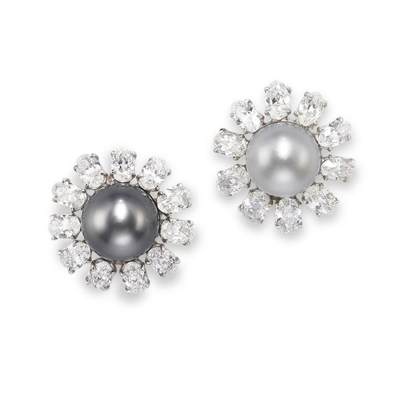A pair of natural pearl and diamond earrings. Each cluster centring a button-shaped grey natural pearl measuring 11.5 x 12.3mm and a button-shaped white natural pearl measuring 11.0 x 10.4mm. Diamonds approximately 7.25 carats total. Est. $ 160,000 – $ 230,000