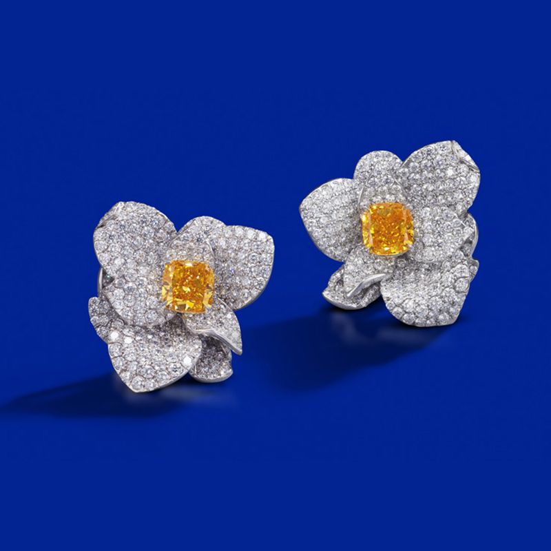 A rare pair of fancy coloured diamond and diamond earrings. Each floral earring centring a radiant-cut fancy vivid yellowish orange diamond weighing 2.87 carats, and a radiant-cut fancy vivid yellow-orange diamond weighing 2.53 carats. Est. $ 360,00 – $ 490,000