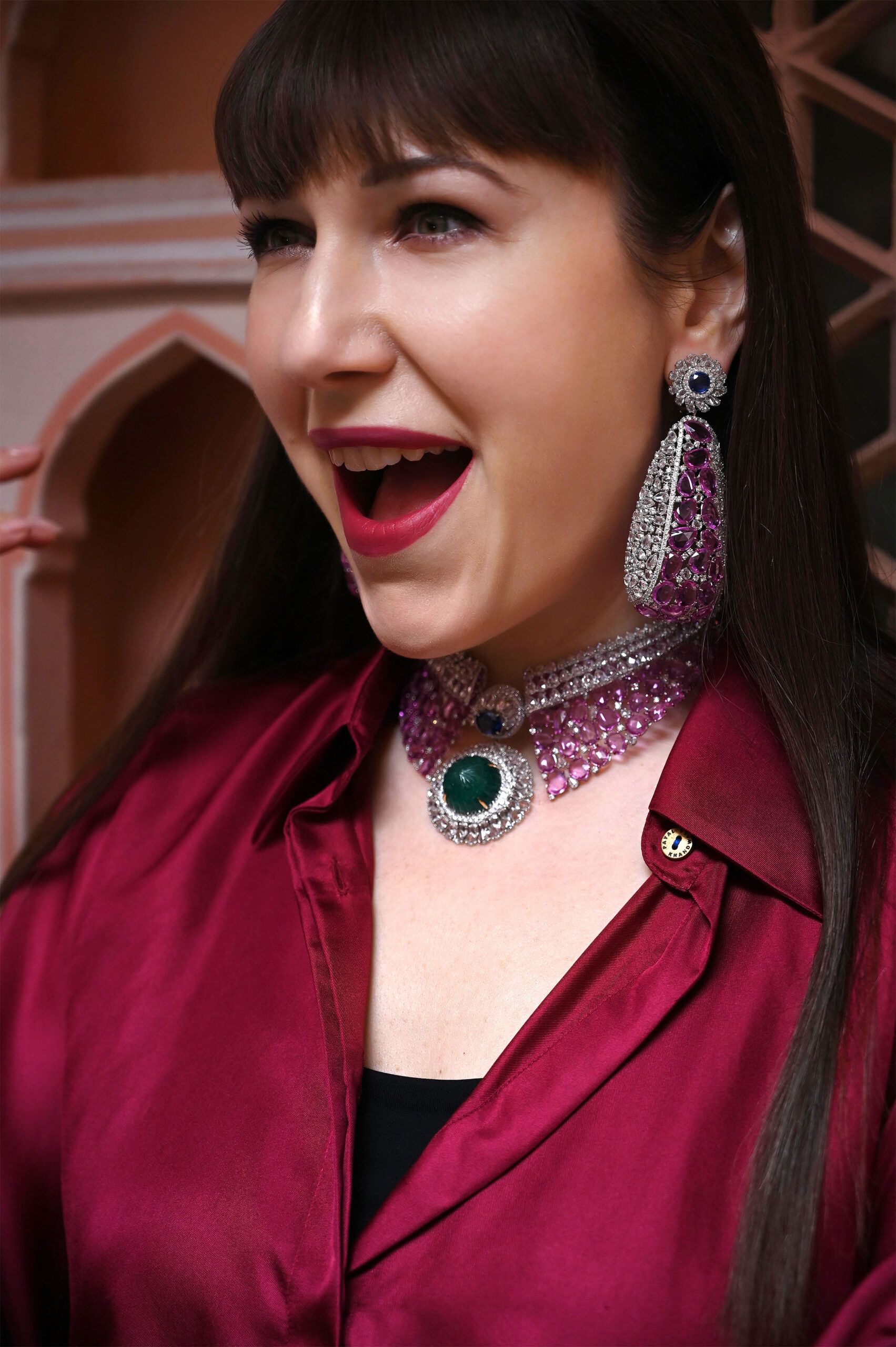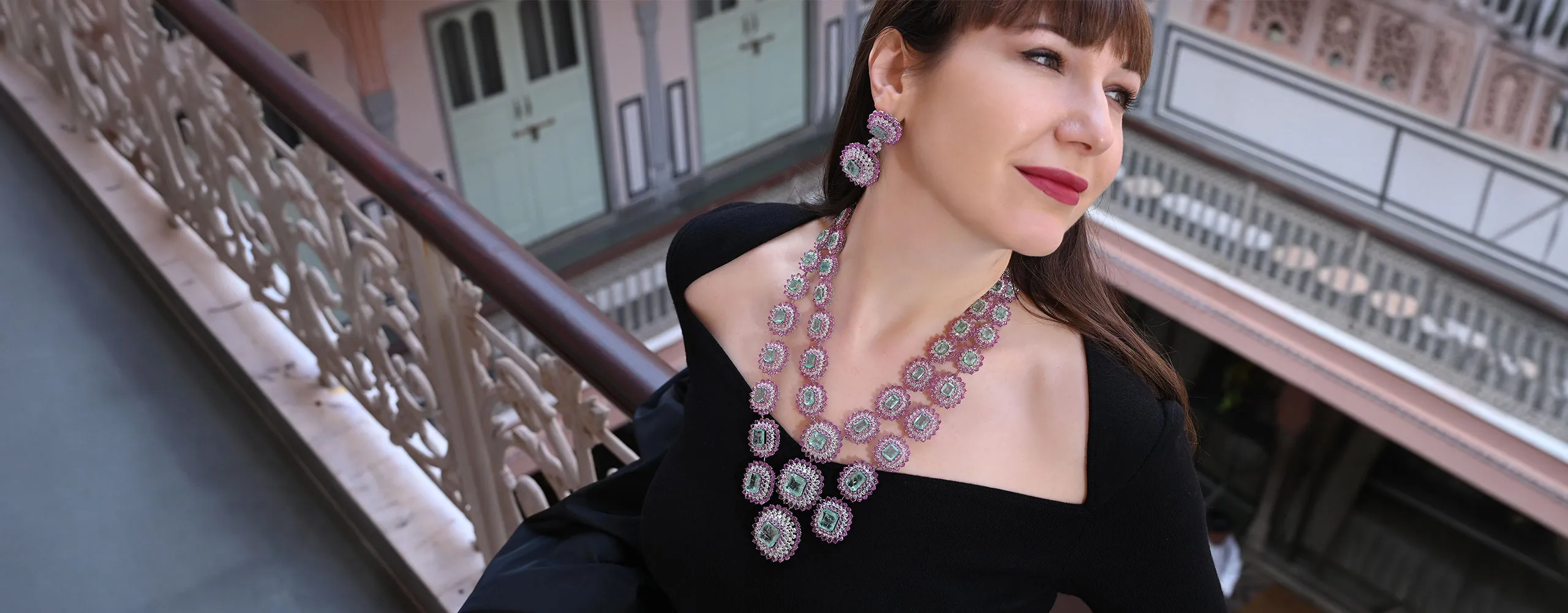 Katerina Perez wears a matching suite from the Diviano One Collection, including a necklace with 37 carats of carved Colombian emerald, 4 carats of Ceylon sapphires, 130 carats of pink sapphires, and 65 carats of rose-cut diamonds