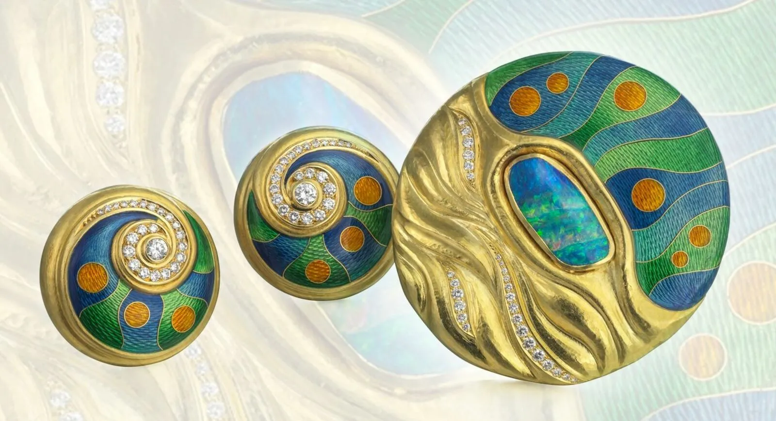 On 12 April the Goldsmith’s company launched ‘De Vroomen: Harmony in Colour and Form’ exhibition that celebrates five decades of artistic collaboration between the husband and wife duo of the De Vroomen jewellery brand. 100 items belonging to British jewellery designer and artist Ginnie de Vroomen and Dutch goldsmith Leo de Vroomen are to be presented alongside a few of Ginnie’s paintings.